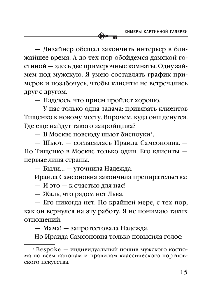 Дела в модном ателье Надежды Раух шли отлично, и она решилась на расширение — шить не только дамские наряды, но и мужские костюмы. Лучший мастер в Москве уже принят на работу, а для презентации нового направления устроен торжественный прием. Гости — известные, солидные, состоятельные люди — с удовольствием любовались изысканными интерьерами ателье, любовно созданными мамой Надежды Ираидой Самсоновной, страстной любительницей антиквариата. Ее недавнее приобретение — авторская копия картины, оригинал которой находится в Третьяковской галерее. Полотно это крайне необычное, и Надежде очень хочется раскрыть его тайну, но ей мешает другая, гораздо более мрачная загадка — один из гостей был отравлен прямо во время приема…