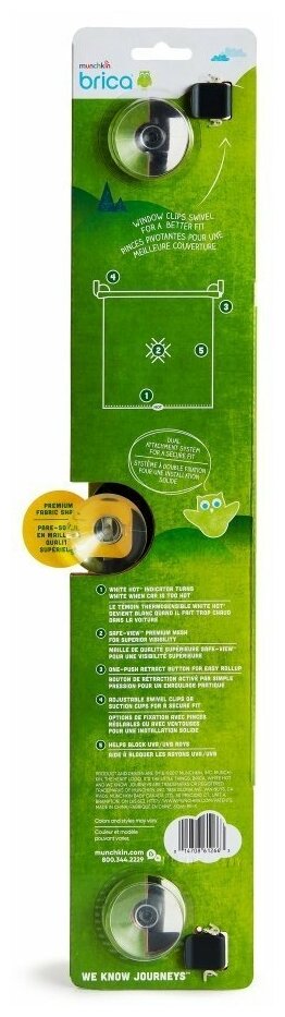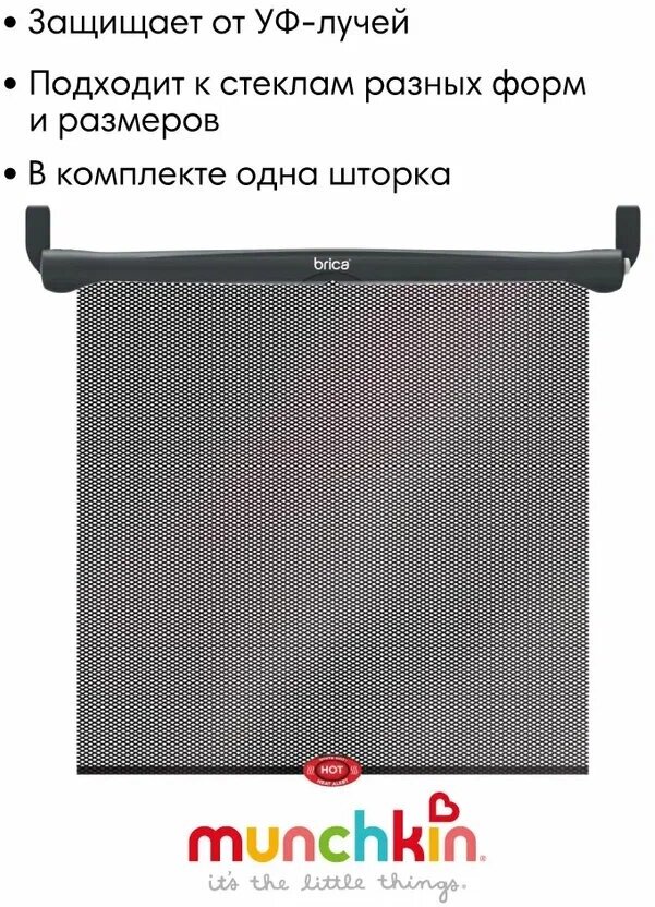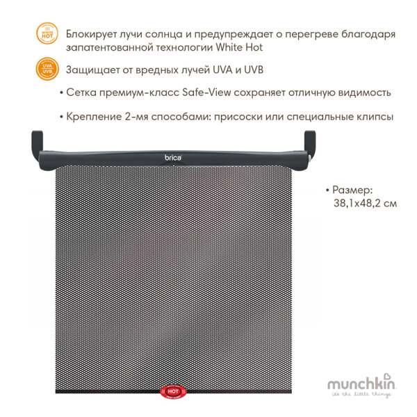 Munchkin Brica солнцезащитная шторка White Hot Sun Safety Shade предназначена для защиты ребенка от солнца во время поездки в автомобиле. Шторку можно прикрепить к стеклу 2-мя удобными способами: с помощью присосок и специальных клипс для крепления. Одним нажатием кнопки рулонная шторка опускается вниз и фиксируется на стекле, так же просто закатывается наверх. Подходит к стеклу практически любой формы и размера. Шторка оснащена запатентованной технологией White Hot - если в машине становится слишком жарко, красный индикатор температуры внизу шторки становится белым, значит пора охладить автомобиль! Сетчатая поверхность шторки Safe-View обеспечивает прекрасный обзор. Особенности: в комплекте 1 шторка защищает от УФ-лучей крепление 2-мя способами: присоски или специальные клипсы проста в управлении (нажми и опусти) подходит к стеклам разных форм и размеров индикатор White Hot оповестит, когда в машине станет жарко сетчатая поверхность Safe-View обеспечивает хороший обзор размеры: 38,1х48,2 см