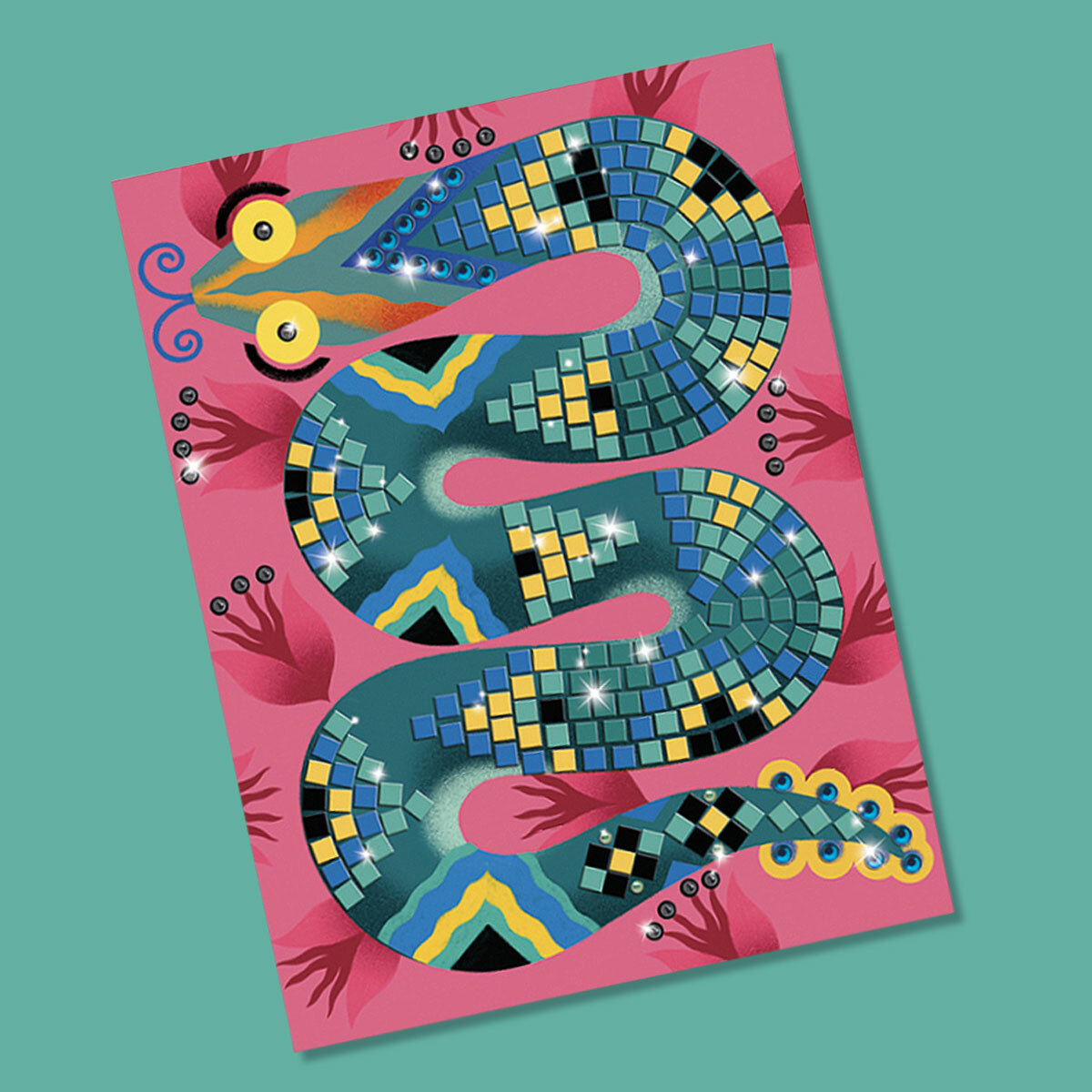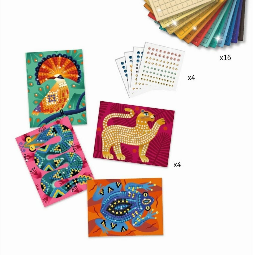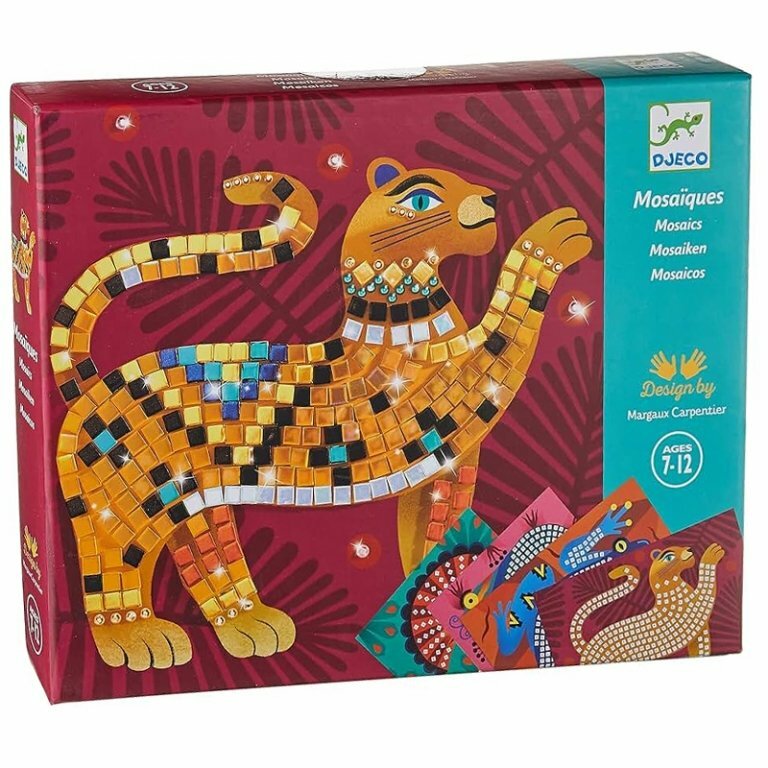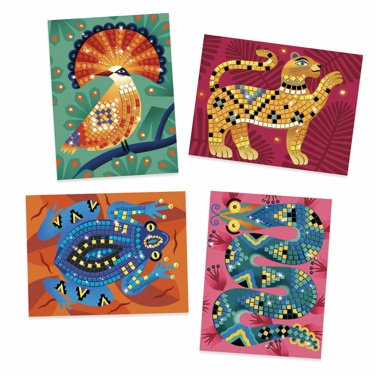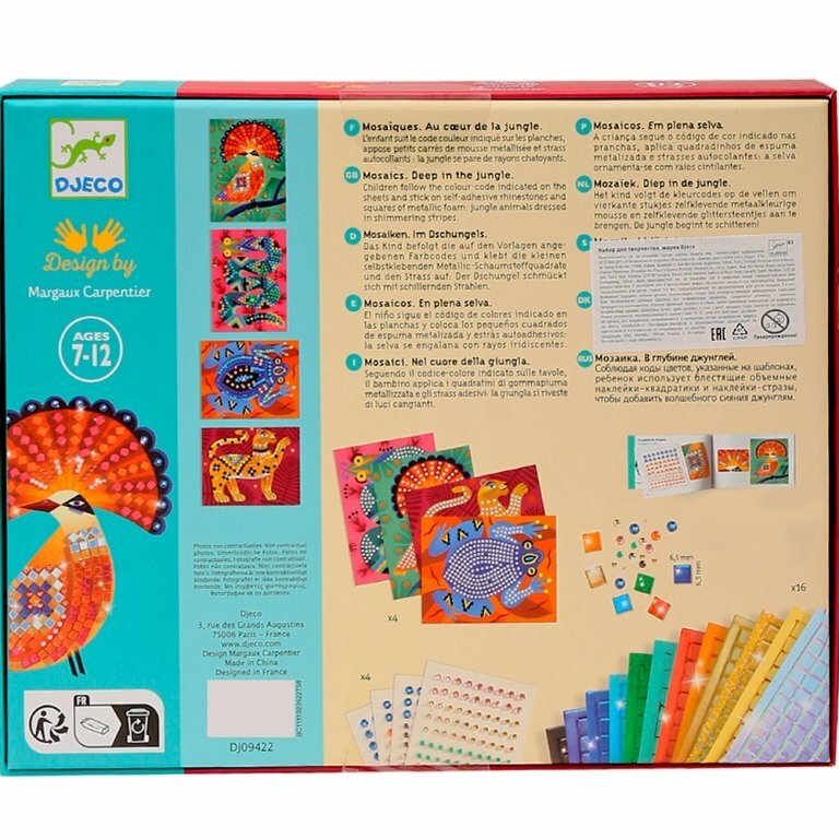 Соберите вместе с ребенком яркую мозаику. В наборе 4 картинки: величественный тигр, веселая лягушка, мерцающая змея и яркая птица. Чтобы мозаика сверкала, используйте наклейки и стразы, которые найдете в коробке.