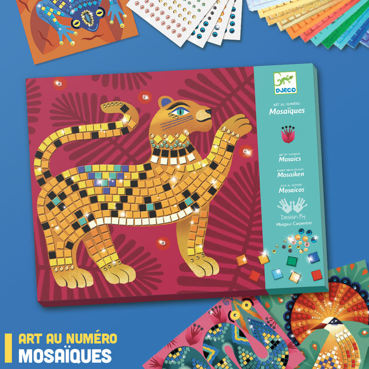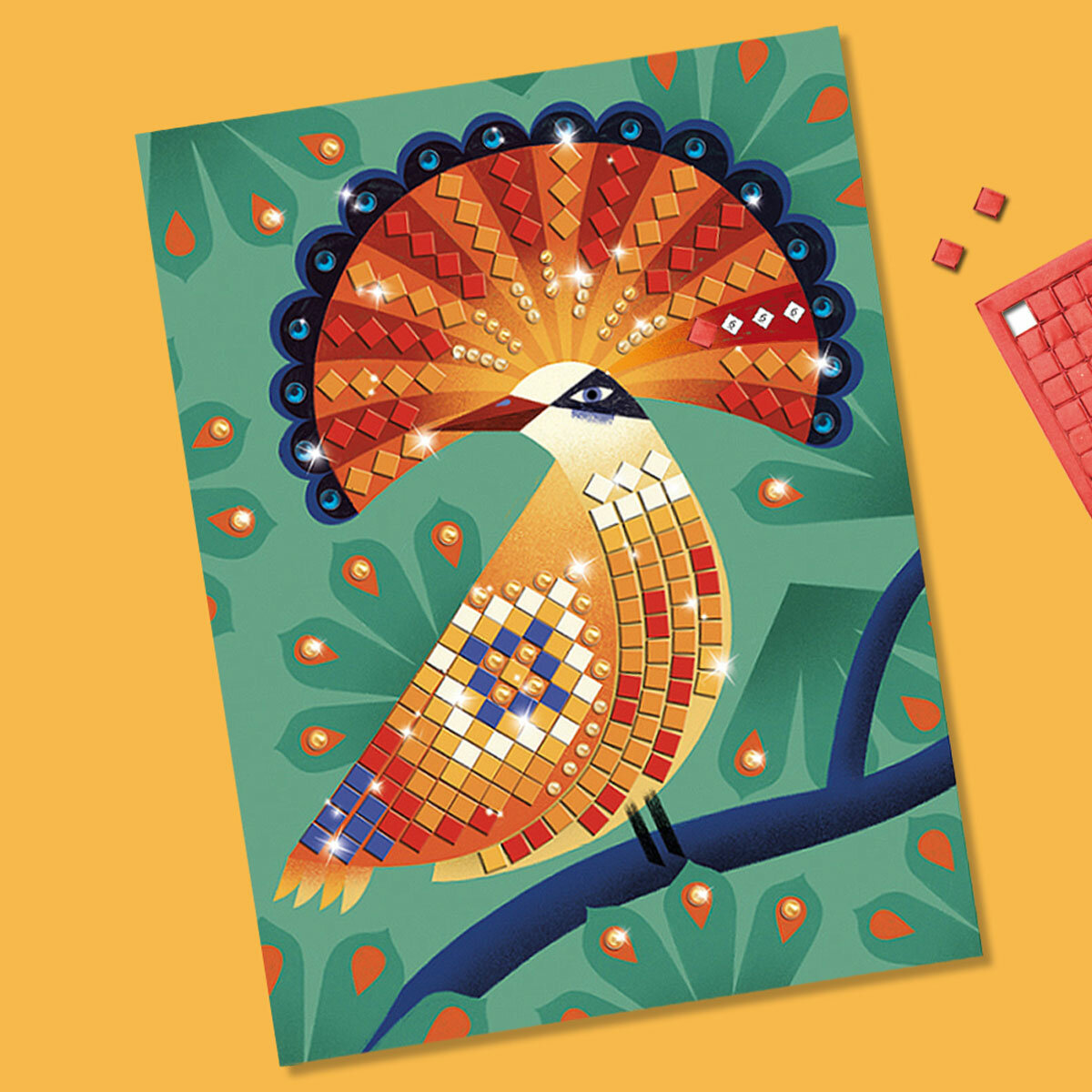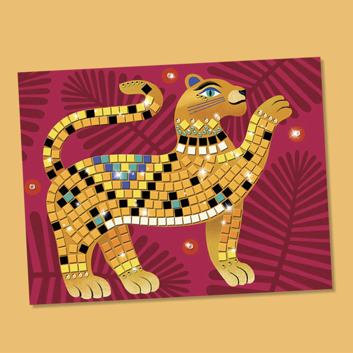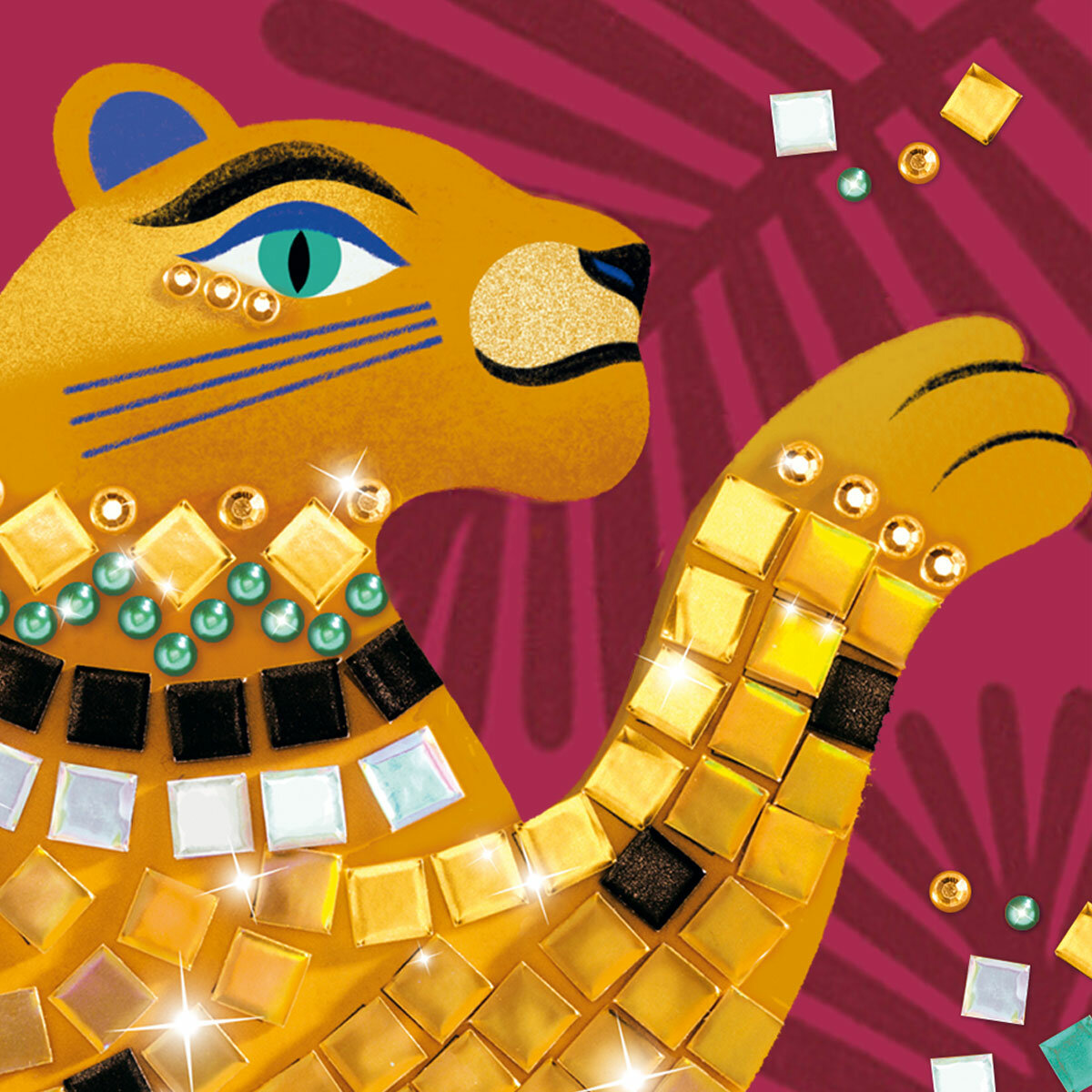 Соберите вместе с ребенком яркую мозаику. В наборе 4 картинки: величественный тигр, веселая лягушка, мерцающая змея и яркая птица. Чтобы мозаика сверкала, используйте наклейки и стразы, которые найдете в коробке.