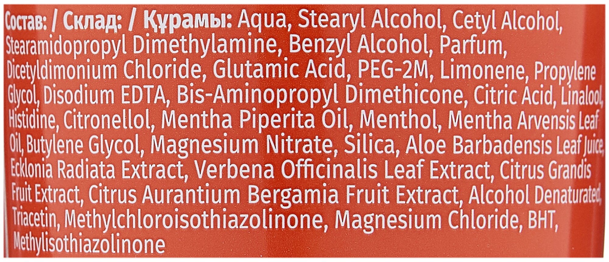 | Состав | Aqua; Stearyl Alcohol; Cetyl Alcohol; Stearamidopropyl Dimethylamine; Benzyl Alcohol; Parfum; Dicetyldimonium Chloride; Glutamic Acid; PEG-2M; Limonene; Propylene Glycol; Disodium EDTA; Bis-Aminopropyl Dimethicone; Citric Acid; Linalool; Histidine; Citronellol; Mentha Piperita Oil; Menthol; Mentha Arvensis Leaf Oil; Butylene Glycol; Magnesium Nitrate; Silica; Aloe Barbadensis Leaf Juice; Ecklonia Radiata Extract; Verbena Officinalis Leaf Extract; Citrus Grandis Fruit Extract; Citrus Aurantium Bergamia Fruit Extract; Alcohol Denaturated; Triacetin; Methylchloroisothiazolinone; Magnesium Chloride; BHT; Methylisothiazolinone |