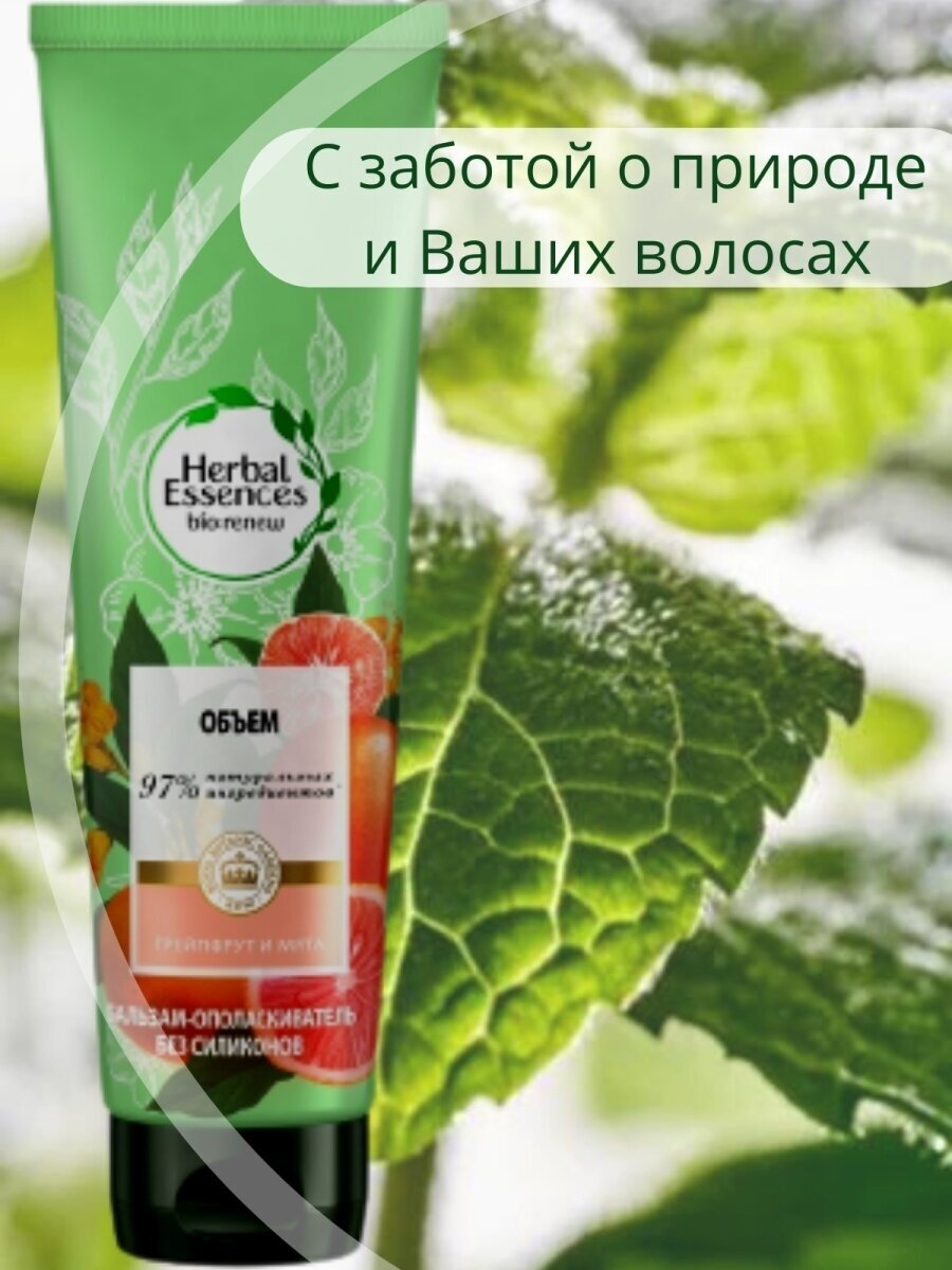Веганский бальзам-ополаскиватель Herbal Essences (Хербал Эсенсес) Объем из коллекции Белый грейпфрут и Мята подходит для тонких, лишенных объема волос. Бальзам-ополаскиватель с активным антиоксидантом питает волосы, наполняя их чарующими ароматами грейпфрута и мяты и придавая им объем без утяжеления. В результате волосы становятся более живыми, мягкими и блестящими. Бальзам-ополаскиватель на 97% состоит из натуральных ингредиентов (очищенная вода и натуральные ингредиенты, прошедшие ограниченную обработку). Его питательная формула обогащена натуральными сертифицированными грейпфрутом и мятой, а также другими растительными экстрактами, качество которых одобрено Королевским Ботаническим Садом Кью в Лондоне. Не содержит продуктов животного происхождения. Herbal Essences аттестован международной организацией PETA как Cruelty-Free: вся продукция бренда не тестируется на животных. Для наилучшего эффекта используйте совместно с шампунем Объем.