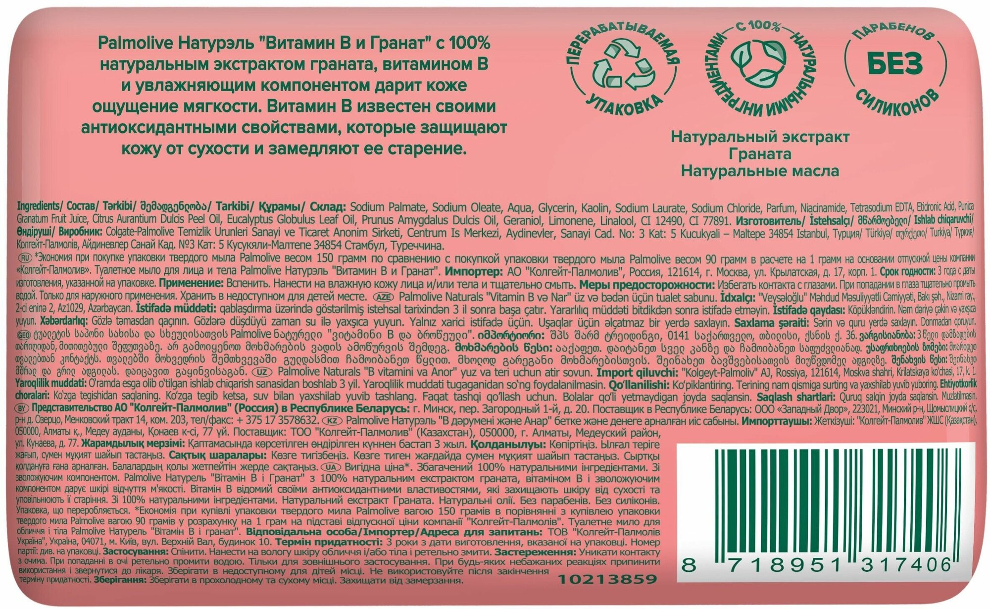 | Особенности | Формула твердого мыла обогащена 100% натуральными ингредиентами; - Подходит для лица и тела; - Содержит 100% натуральный экстракт граната и 100% натуральные масла; - Содержит увлажняющий компонент; - Не содержит парабенов и силиконов; - Перерабатываемая упаковка мыла весом 150 г -Твердое мыло Palmolive произведено в Турции и соответствует международным стандартам качества |