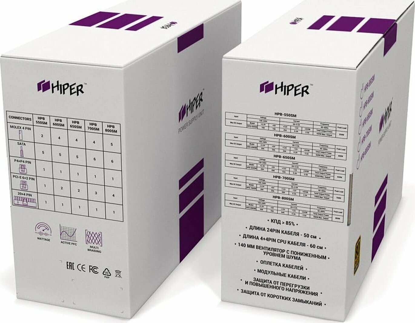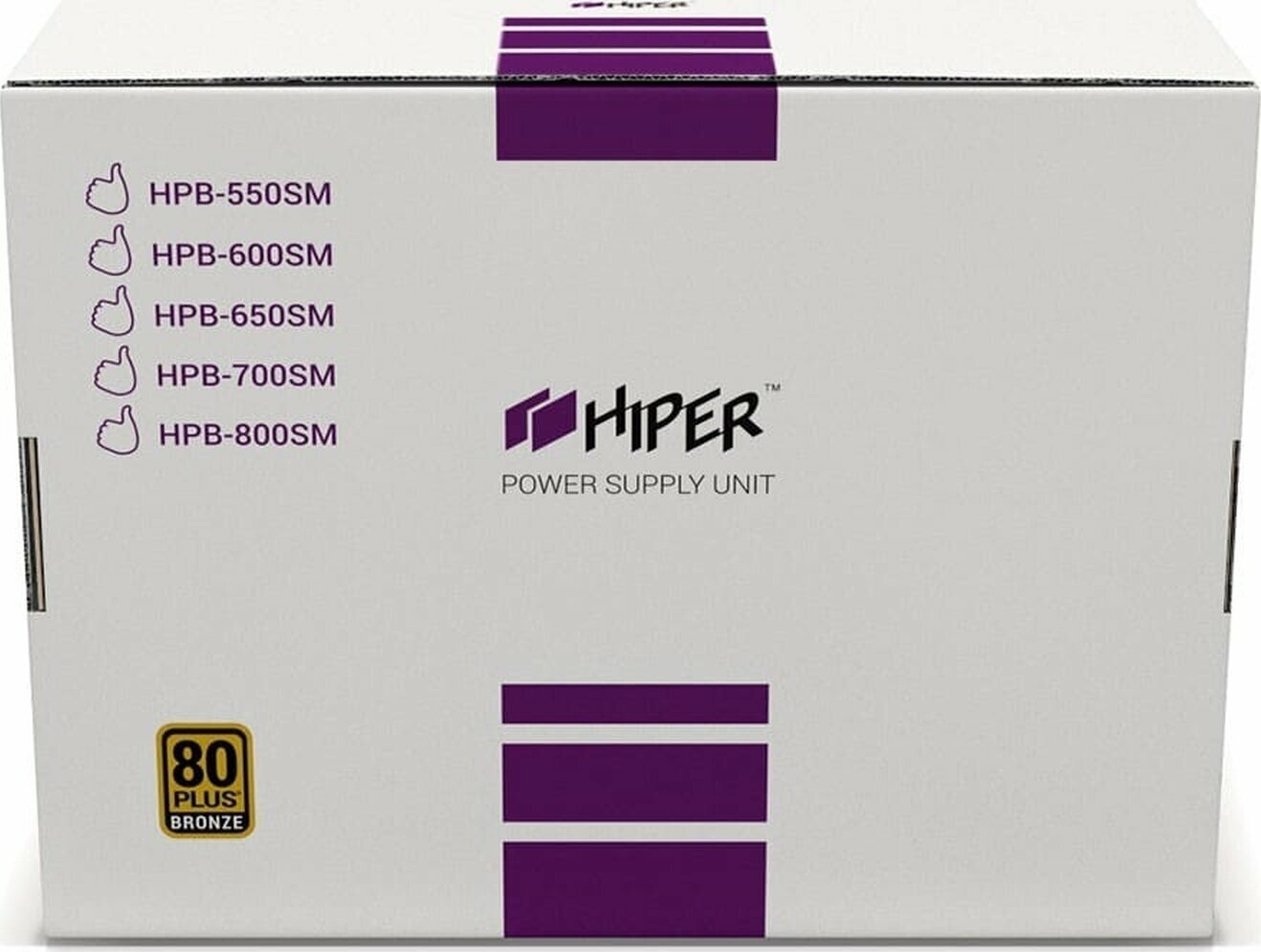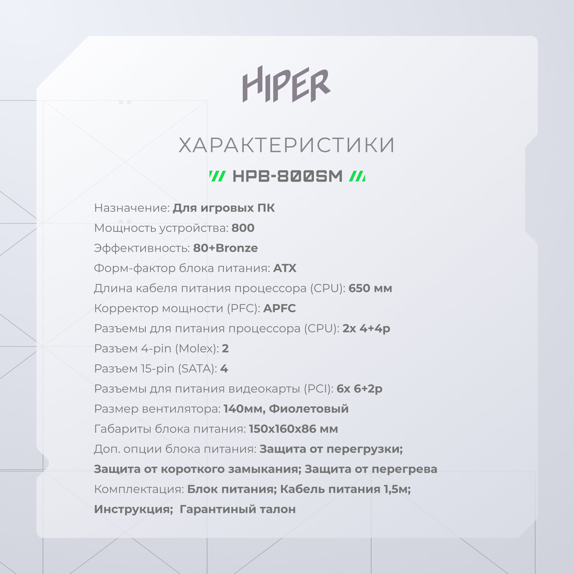 HIPER HPB-800SM — блок питания с оптимизированным для бесшумной работы 140 mm вентилятором. Эффективность 80 PLUS Bronze (до 85%). Высокая мощность по шине +12V. Для установки в рабочие компьютеры, требующие большую энергоэффективность, в том числе в игровые компьютеры, оснащенные мощными видеокартами.
