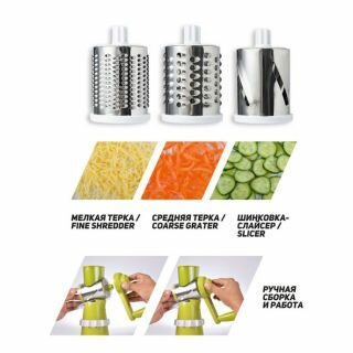 Дополнительная информация | Пластиковый толкатель в комплекте. Ручная блокировка, размеры горловины: 6.0*7.5 см. Основание и ручка: АБС пластик. Терка-овощерезка механическая. |