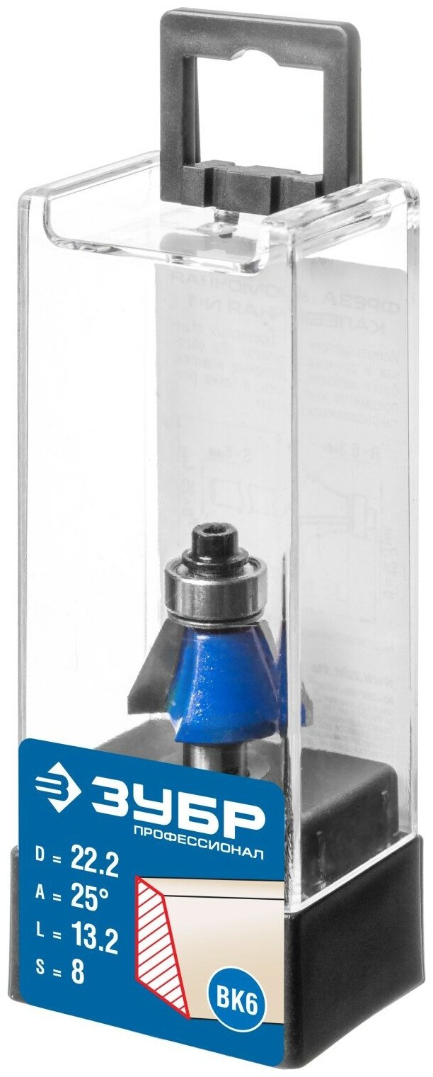 Фреза кромочная калевочная(фасочная) №9, D= 22,2мм, рабочая длина-13,2мм, угол наклона-25 градусов, хв.-8мм, d-12,7мм, ЗУБР Профессионал