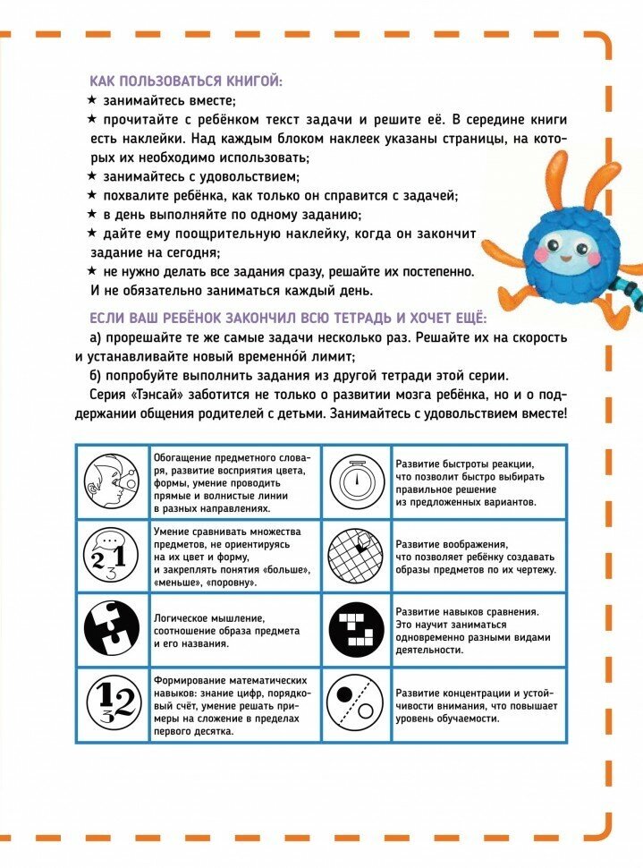 Рабочая тетрадь с наклейками для детей 5-6 лет, купили всю серию .6 штук. C японским психологом Рюта Кавашима знакома непонаслышке, сама успешно занимаюсь по его "взрослым" пособиям в методике KUMON, и других книг для развития и сохранения интеллекта у него достаточно, а вот с детскими пособиями я до этого не встречалась. Интересная возрастная градация от 2-3 лет до 3 класса начальной школы, по одному пособию на год. Обычно все стараются максимально уложиться в дошкольный период, кроме Кумона, который идет дальше. Кроме самих примеров, дальше идет несколько необычных заданий на поиск противоположностей. Заданий немного 32 странички, 4 из которых выпадают на преди- и послесловие. Вполне можно включить в домашнюю образовательную библиотеку.