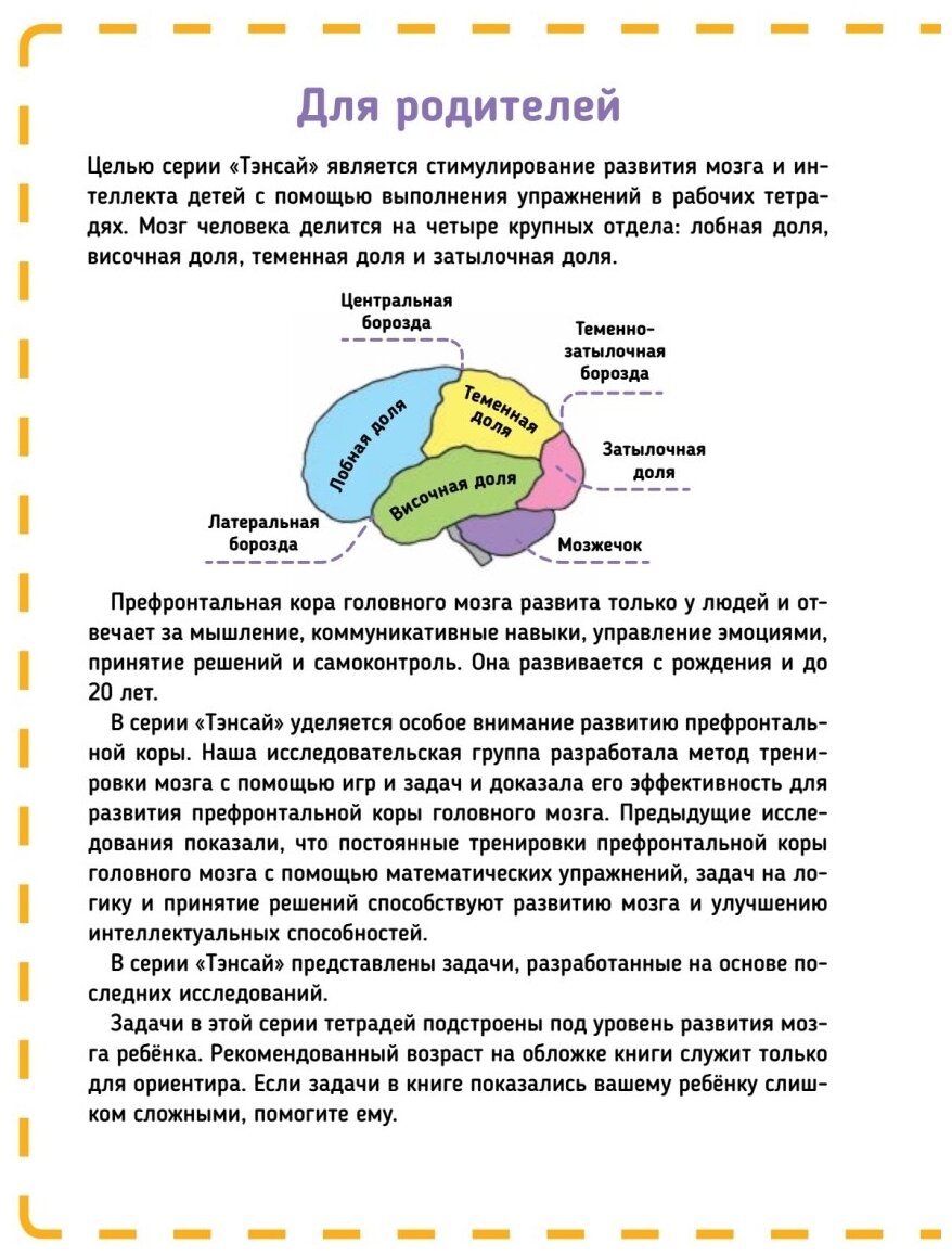 Мозг можно тренировать не только в зрелом возрасте для поддержания активность памяти, развития ее потенциала или предупреждения деменции. Доказано, что регулярные занятия с детьми от 2 до 12 лет, в период активного развития нашего самого важного органа - мозга, способны привести к поразительным результатам. Книги "Тэнсай", название которых в переводе с японского означает "одаренный, умный, гений", направлены на комплексное развитие мышления, логики, памяти, внимания и наблюдательности. Простые игры и увлекательные задания простимулируют работу как правого, так и левого полушария мозга, поспособствуют развитию интеллекта, логики и умственных способностей вашего ребенка. В серию входят 6 книг, рассчитанных на разный возраст: 2-3 года, 3-4 года, 5-6 лет, 3 тетради для детей младшего школьного возраста. "Тэнсай" заботится не только о развитии умственной деятельности ребенка, но и способствует хорошему общению между детьми и родителями. Занимайтесь вместе с удовольствием!