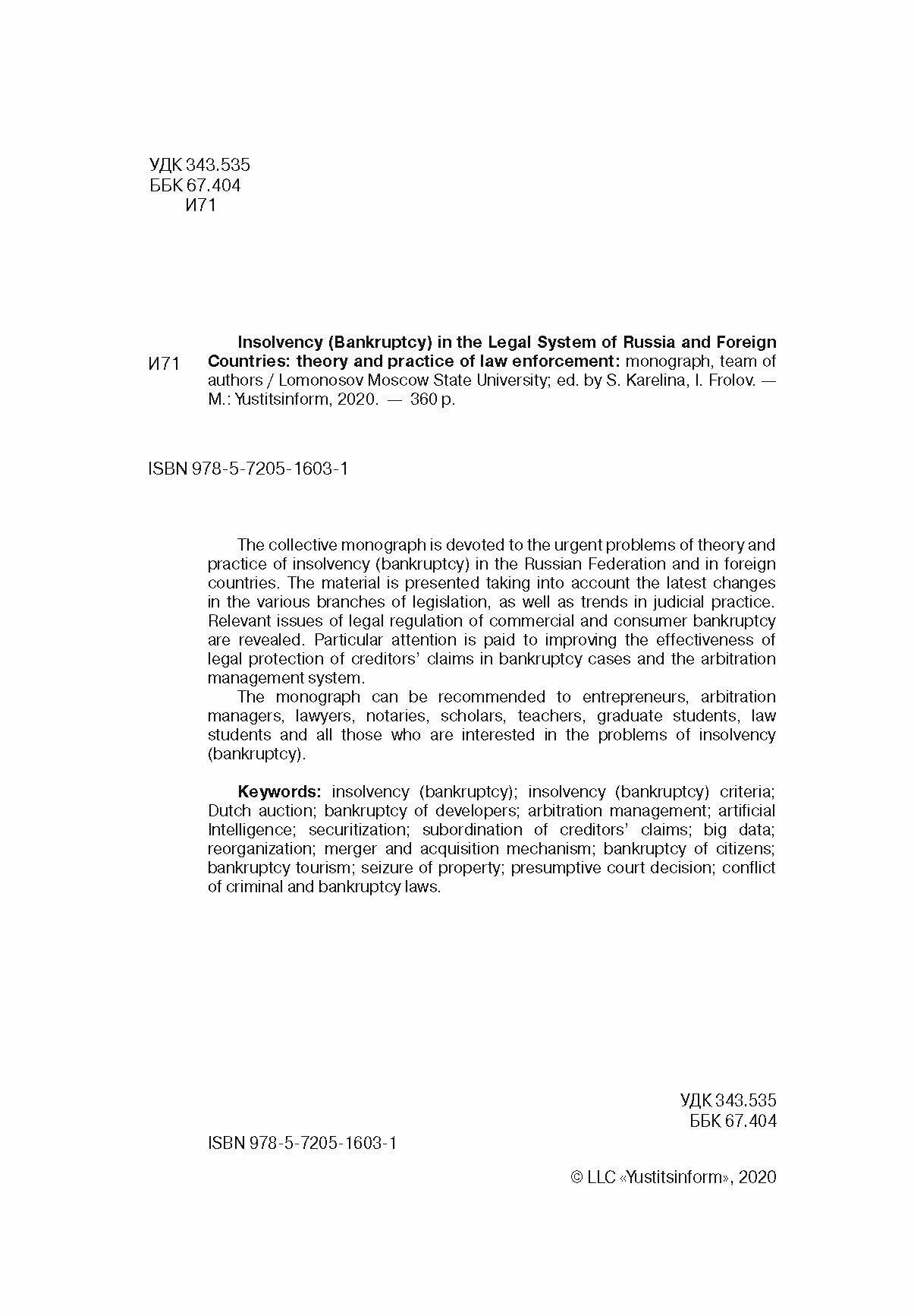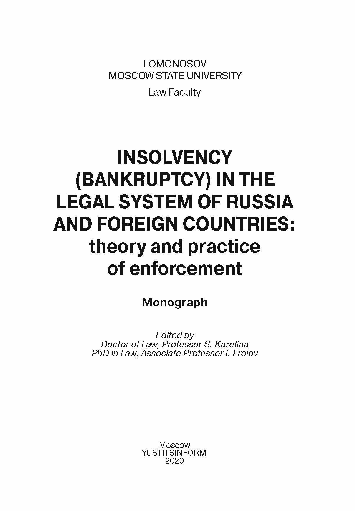 Институт несостоятельности (банкротства) в правовой системе России и зарубежных стран: теория и прак (Бобылева Алла Зиновьевна, Карелина Светлана Александровна, Фролов Игорь Валентинович); Юстицинформ, 2020