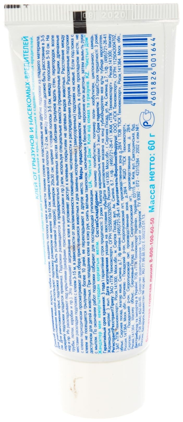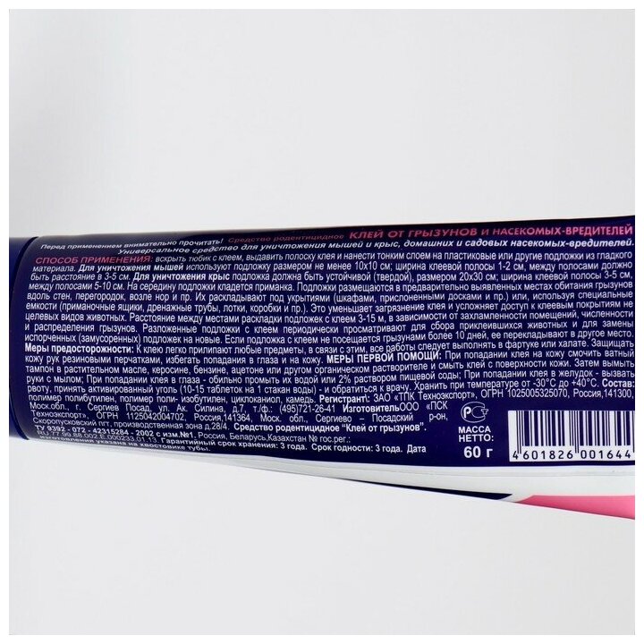 Состав товара:Полимер, полибутилен, полимер поли- изобутилен, циклоканиол, камедь.Меры предосторожности:Хранить в сухом прохладном месте, недоступном для детей и животных. При попадании клея на кожу рук, снять ватным тампоном, смоченным в бензине, керосине или ацетоне, затем вымыть руки с мылом. По окончании работ подложки собирают для последующей утилизации.Способ применения:Вскрыть тюбик с клеем, выдавить полоску клея и нанести тонким слоем на пластиковые или другие подложки из гладкого материала. Подложки размещаются в предварительно выявленных местах обитания вдоль стен, перегородок, возле нор. Разложенные подложки с клеем периодически просматривают для сбора приклеившихся животных и для замены испортившихся. если подложка не посещается грызунами более 10 дней, ее перекладывают в другое место.