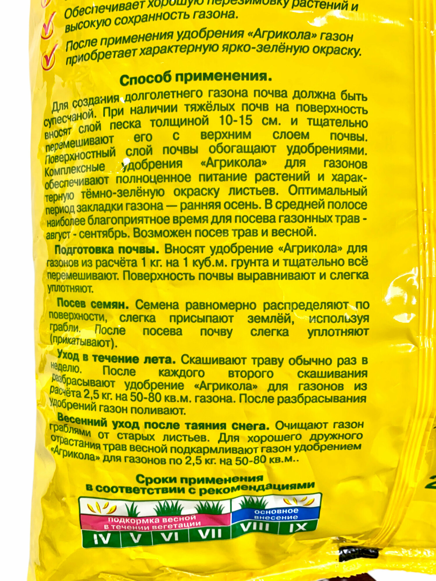 | Способ применения | Для создания долголетнего газона почва должна быть супесчаной. При наличии тяжелых почв на поверхность вносят слой песка толщиной 10-15 см и тщательно перемешивают его с верхним слоем почвы. Поверхностный слой почвы обогащают удобрениями. Комплексные удобрения "Агрикола" для газонов обеспечивают полноценное питание растений и характерную темно-зеленую окраску листьев. Оптимальный период закладки газона - ранняя осень. В средней полосе наиболее благоприятное время для посева газонных трав - август-сентябрь. Возможен посев трав и весной. |