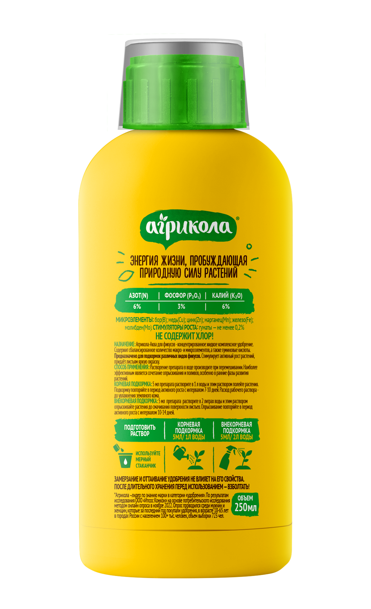 Используется как для корневой, так и для внекорневой подкормки. При норме разведения 5-10 мл удобрения на 1 л воды, флакона объемом 250 мл достаточно для получения 25-50 л подкормочного раствора.