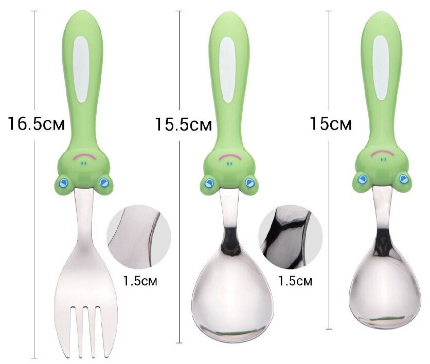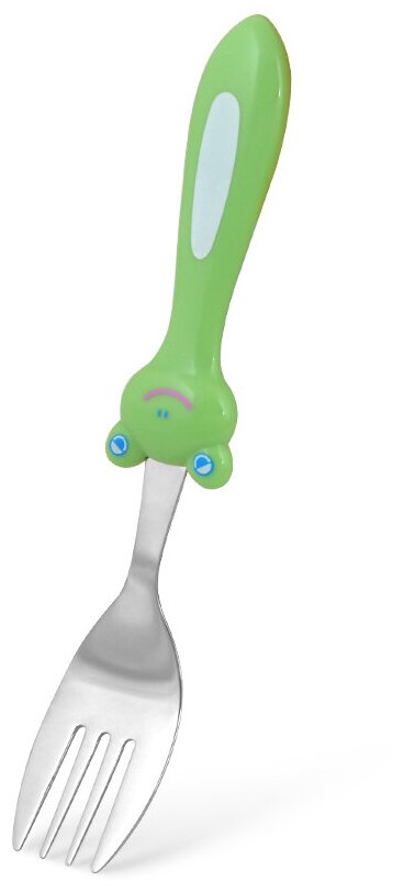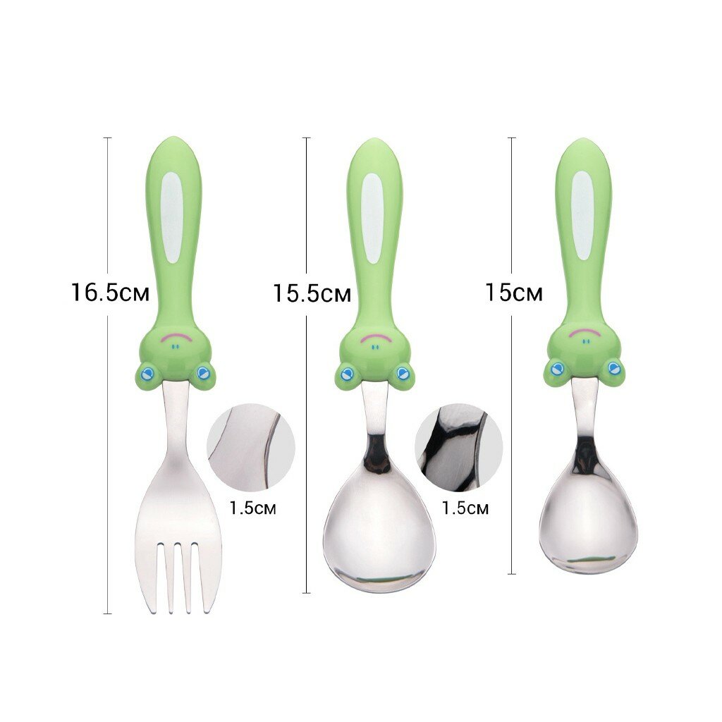 Набор столовых приборов лягушка 3 пр. изготовлен из нержавеющей стали. Предназначен для безопасного и комфортного приучения малыша к самостоятельному приему пищи. Ручки изготовленны из пластика, не скользят и удобны для захвата детской ладошкой.