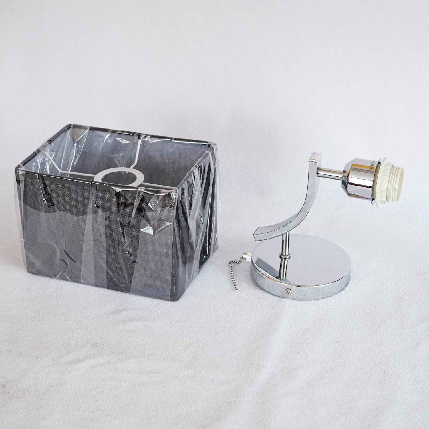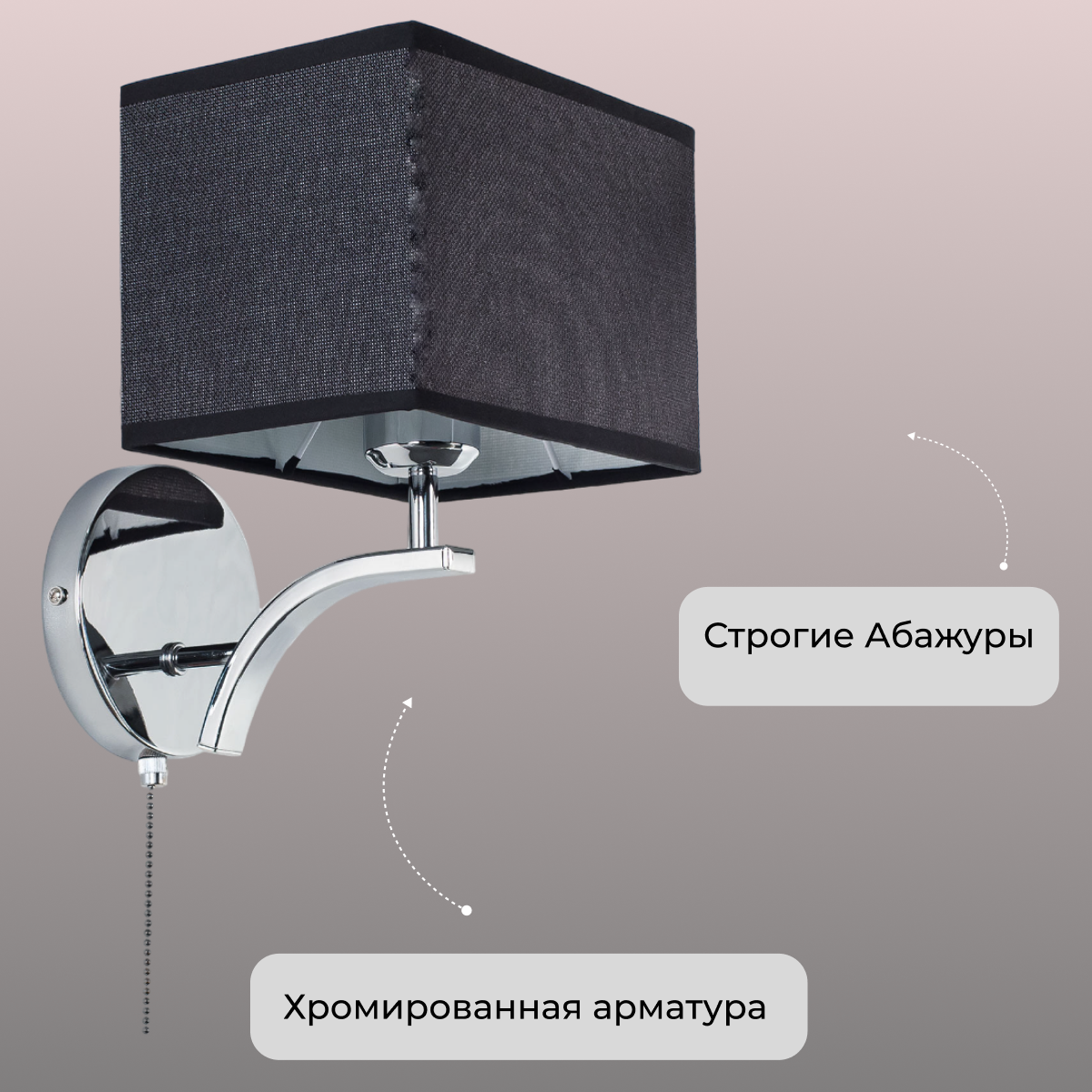 Основание бра выполнено из глянцевого серебристого металла, закрепленный на изогнутом держателе абажур — из ткани нейтральной расцветки. Модель оснащена удобной металлической цепочкой-выключателем.