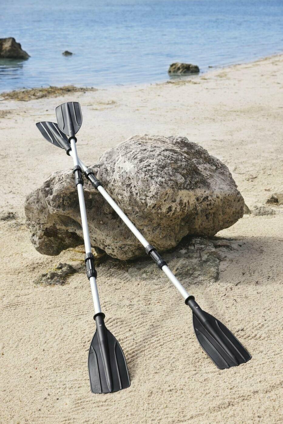 Легкие алюминиевые весла Bestway 62064 разбираются на две части: ручка и лопасть и легко укладываются в сумку или рюкзак. Можно составить вместе и получить одно длинное весло для байдарки. Длина каждого весла 152 см, длина весла при соединении 254 см. Легкие и надежные алюминиевые рукоятки оснащены кольцами для фиксации весел в уключинах.