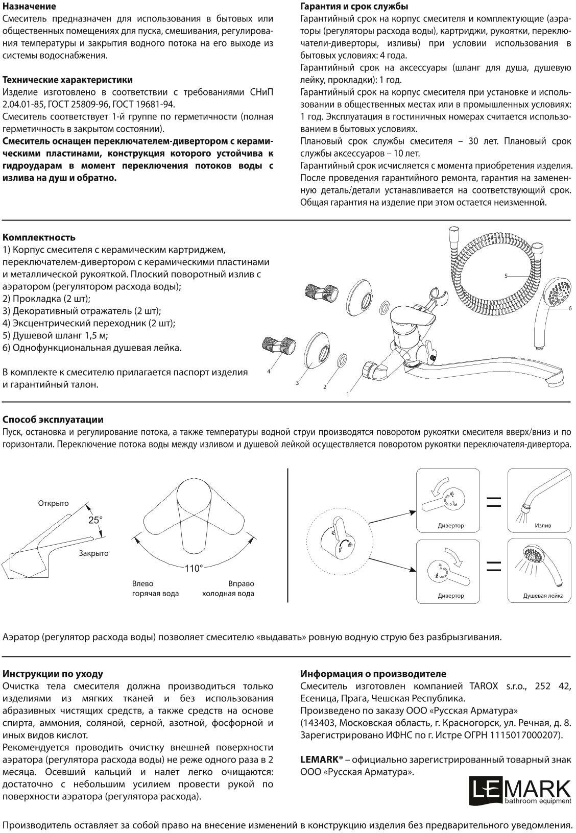 Комплектация: Аэратор. Керамический картридж 35 мм. Кнопочный переключатель с функцией ручной фиксации. Аксессуары в комплекте: шланг 1,5 м, 1-функциональная лейка. Металлическая рукоятка.