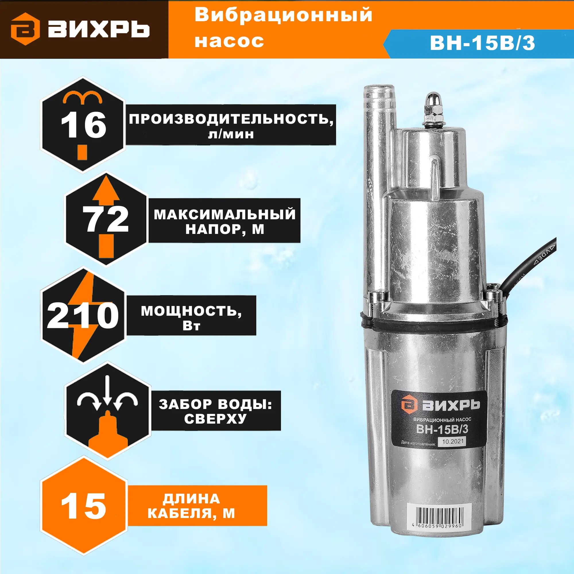 Вибрационный насос Вихрь ВН-15В/3 предназначен для подачи воды в бытовых условиях из скважин внутренним диаметром от 85 мм и более, могут использоваться также для подачи воды из шахтных колодцев, резервуаров и открытых водоемов для полива садов и огородов. Насосы способны перекачивать воду на большие расстояния горизонтально (свыше 100 м), т.е. подавать воду из водоемов, расположенных на значительном расстоянии от мест использования воды.