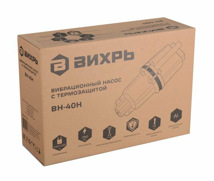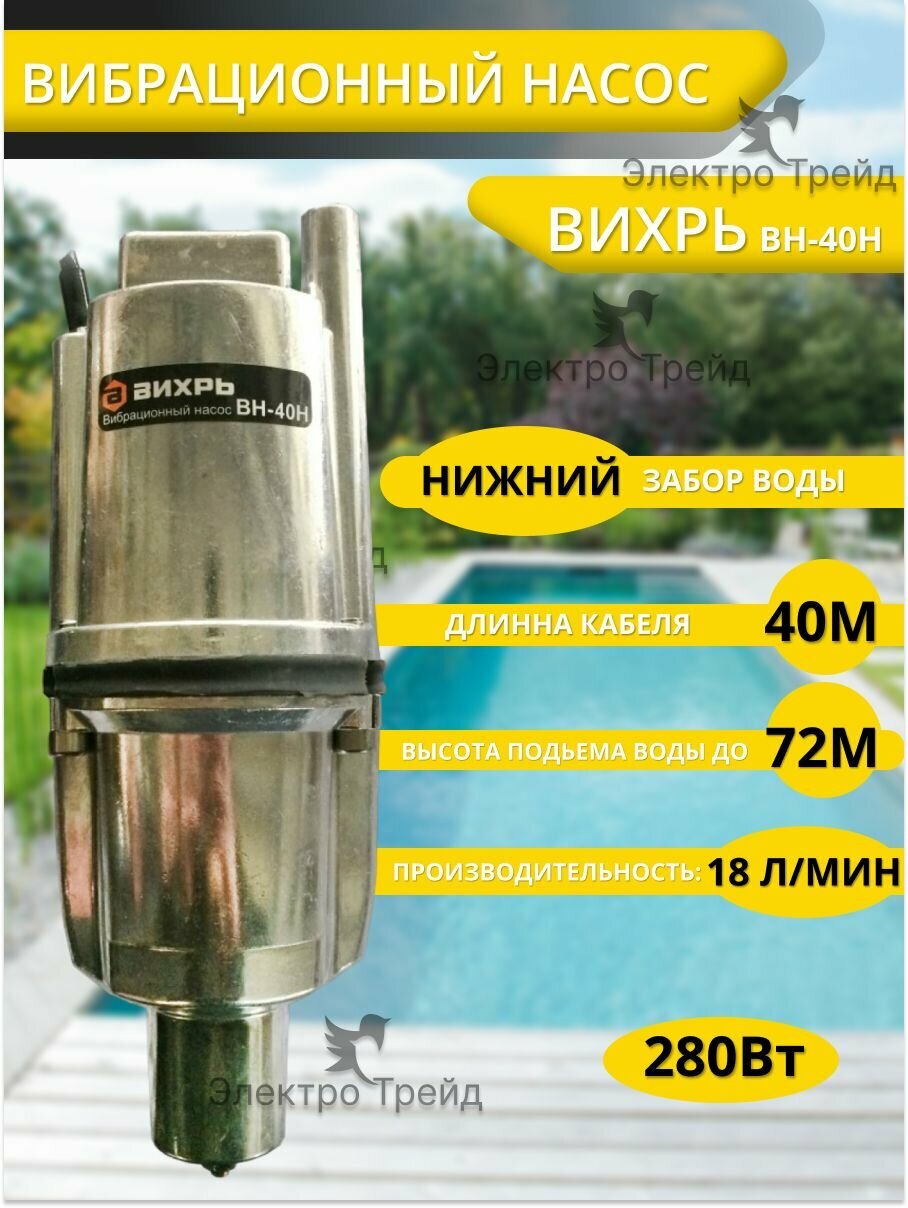 Вибрационный насос Вихрь ВН-40Н предназначен для подачи воды в бытовых условиях из скважин внутренним диаметром от 85 мм и более, могут использоваться также для подачи воды из шахтных колодцев, резервуаров и открытых водоемов для полива садов и огородов. Насосы способны перекачивать воду на большие расстояния горизонтально (свыше 100 м), т.е. подавать воду из водоемов, расположенных на значительном расстоянии от мест использования воды.
