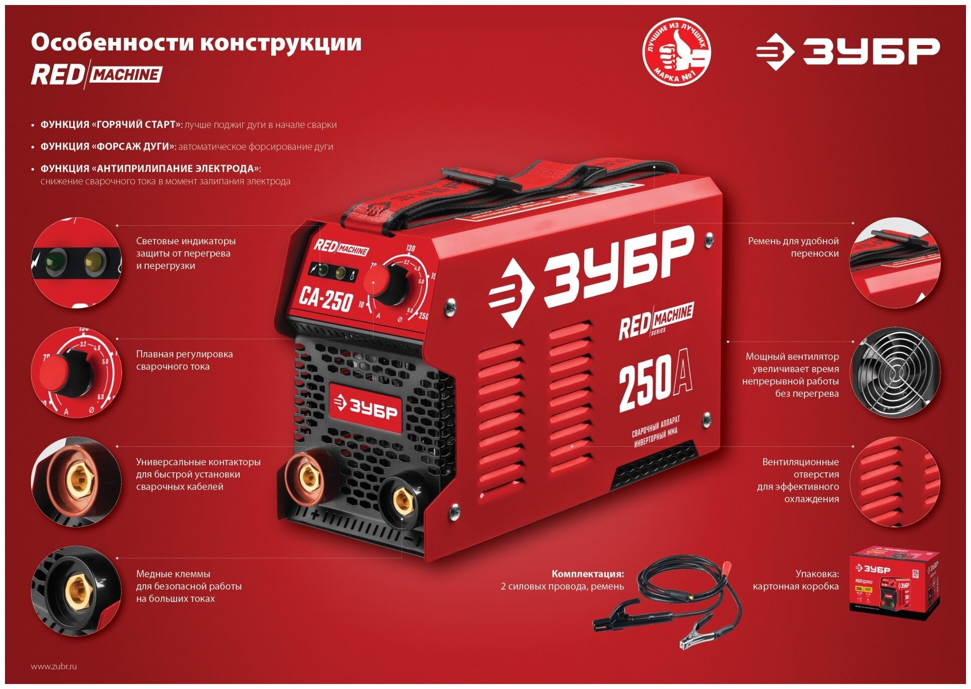 Сварочный аппарат Зубр , потребляемая мощность 5.7кВт, методы сварки: ММА DC, автоматический форсаж дуги, сварочный ток от 20A до 160A