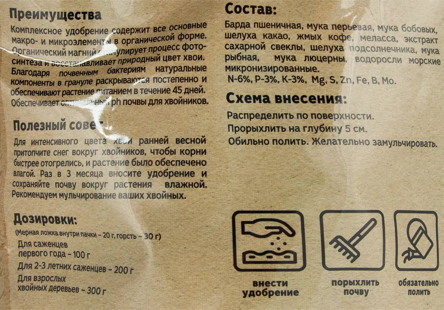 Комплексный стимулятор роста и иммунитета. Обеспечивает красивый внешний вид хвои, тонус и здоровье растения на всех фазах развития. Ускоряет образование гумуса, уменьшает потребность в поливе. Запас питательных веществ на 100 дней.