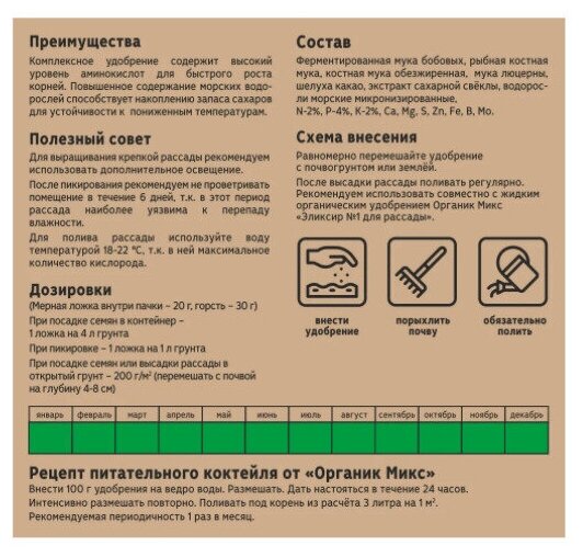 | Способ применения | Мерная ложка внутри пачки - 20 г, горсть - 30 г. При посадке семян в контейнер - 1 ложка на 4 л грунта. При пикировке - 1 ложка на 1 л грунта. При посадке семян или высадки рассады в открытый грунт - 200 г\м2 (перемешать с почвой на глубину 4-8 см). Может применяться круглогодично. Схема внесения |