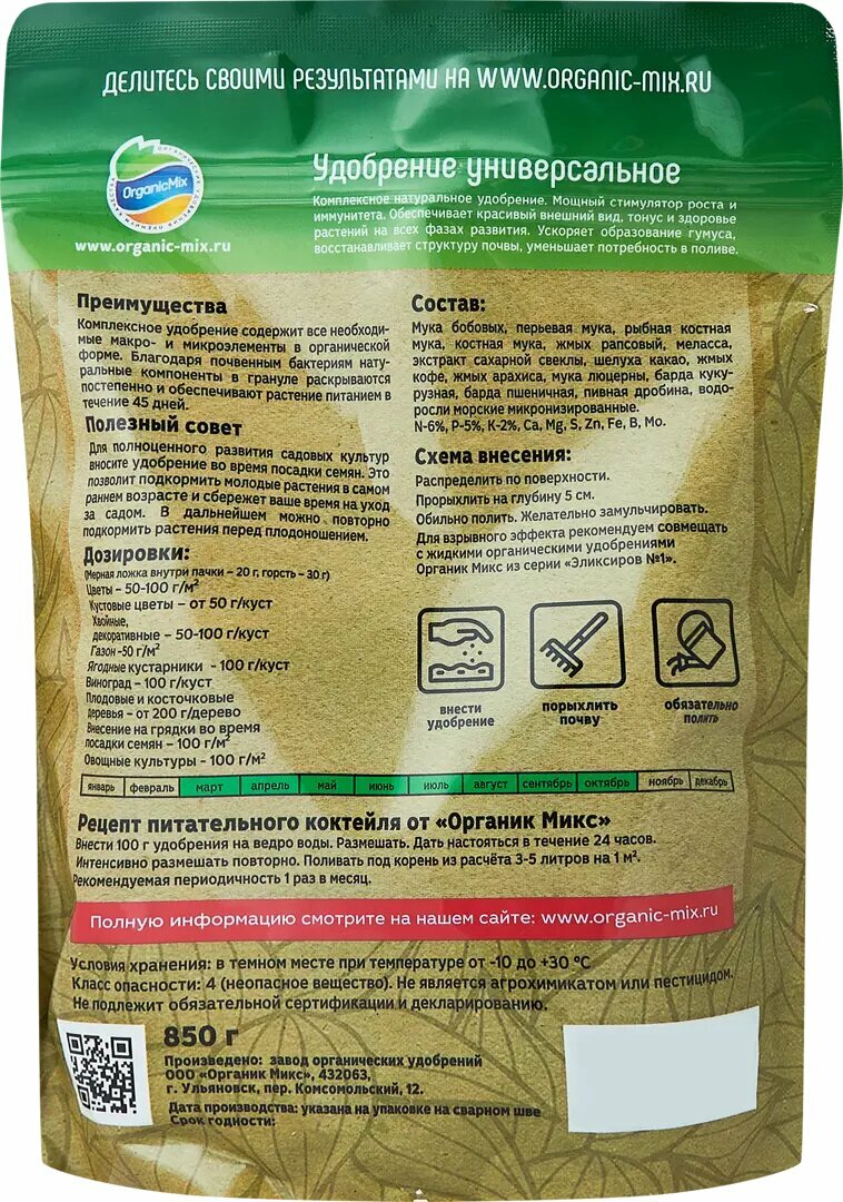 | Способ применения | Распределить по поверхности. Прорыхлить на глубину до 5 см. Обильно полить. Желательно замульчировать. Для взрывного эффекта рекомендуется совмещать с жидким органическим удобрением Органик Микс "Эликсир № 1 Универсальный". (1 горсть - 30г) Цветы -50-100 г\м2. Кустовые цветы - от 50 г\м2. Хвойные декоративные - 50-100 г\м2. Газон - 50 г\м2. Ягодные кустарники - 100 г\куст. Виноград - 100 г\куст. Овощные - 50-100 г\м2. Плодовые и косточковые деревья - от 200 г\м2. Внесение на грядки при посеве семян - 100 г\м2. Применять с марта по октябрь. |