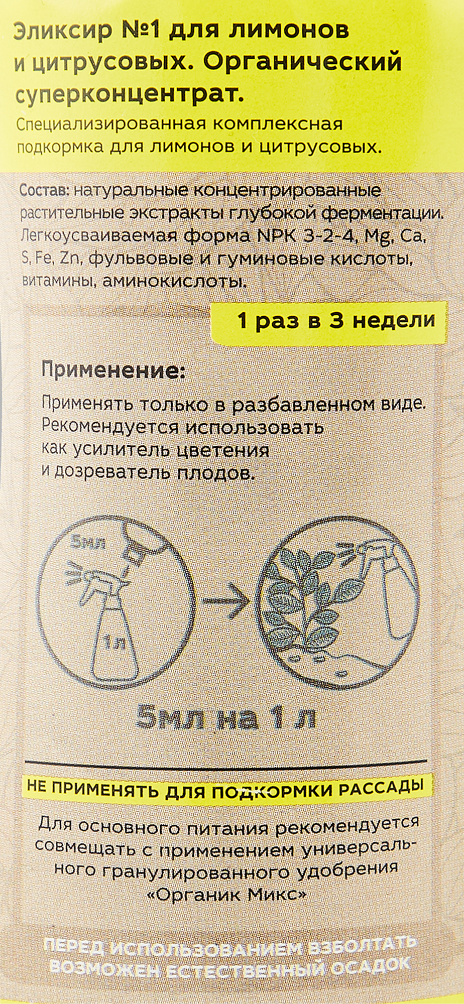 | Способ применения | 5 мл разбавить в 1 л воды. Применять 1 раз в 3 недели в период цветения. Перед использованием взболтать, возможен естественный осадок. Применять только в разбавленном виде. |