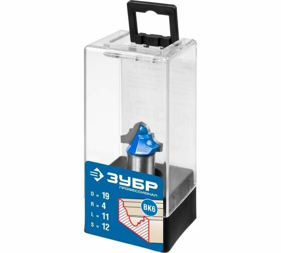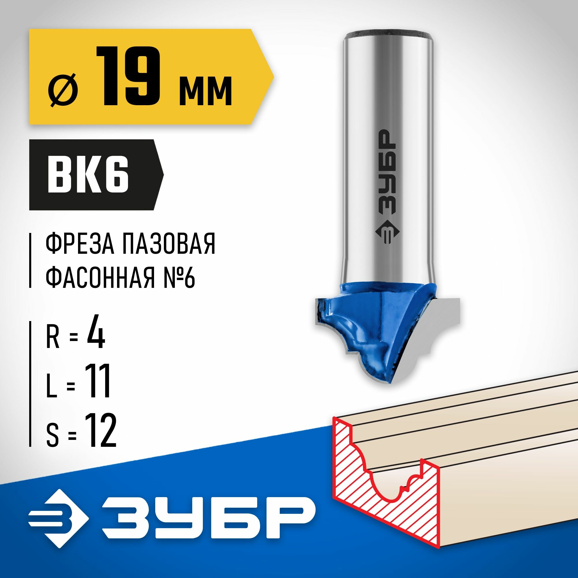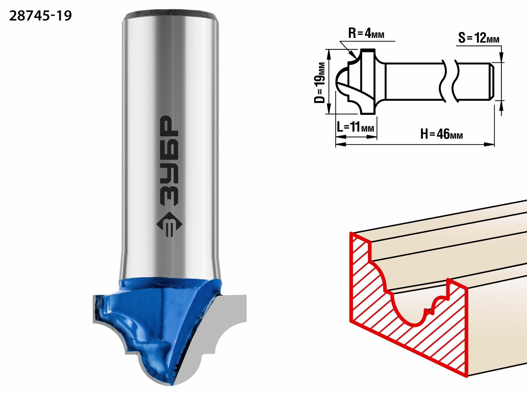 Фреза пазовая фасонная №6, D= 19мм, рабочая длина-11мм, радиус-4мм, хв.-12 мм, ЗУБР Профессионал