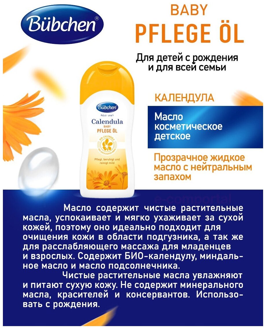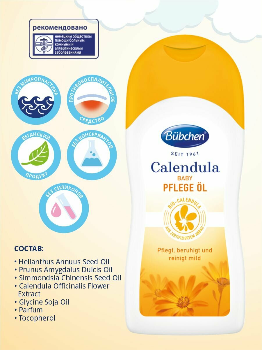Масло содержит чистые растительные масла, успокаивает и мягко ухаживает за сухой кожей, поэтому оно идеально подходит для очищения кожи в области подгузника, а так же для расслабляющего массажа для младенцев и взрослых. Содержит БИО-календулу, миндальное масло и масло подсолнечника. Чистые растительные масла увлажняют и питают сухую кожу. Не содержит минерального масла, красителей и консервантов. Использовать с рождения.