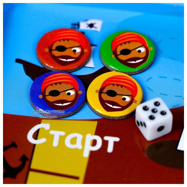 В комплекте: игровое поле, фигурка "Пират" (4 шт.), игральный кубик (1 шт).