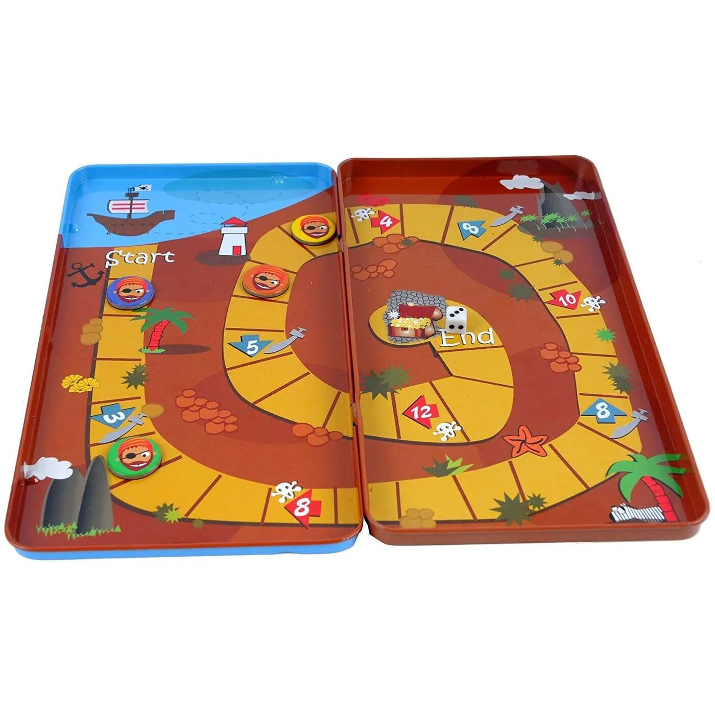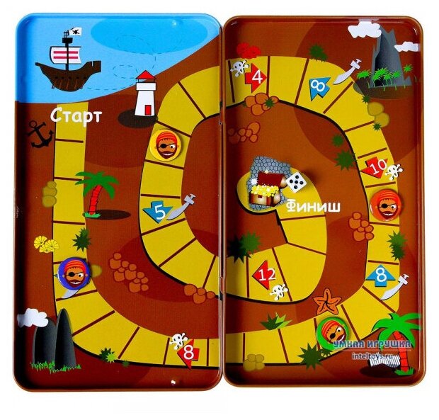 Путь к сокровищам с затонувших пиратских кораблей долгий, насыщенный разными приключениями. И того, кто преодолеет его первым, ожидает награда-сундуки с золотыми монетами. Перемещайтесь по полю в соответствии с числом, выпавшем на игровом кубике. Остановившись на определенной клетке, нужно выполнить то задание, которое на ней нарисовано.