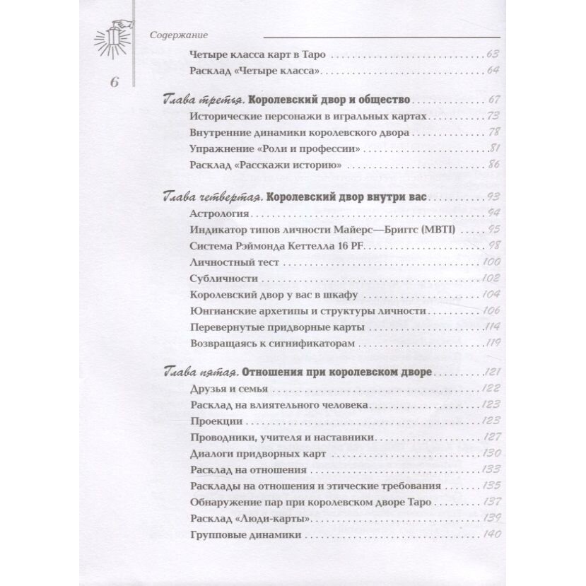 У многих тарологов возникают проблемы с интерпритацией придворных карт, что зачастую затрудняет полноценное видение расклада. Поскольку эти карты считаются одними из самых сложных (они могут показывать не только людей, но и события, черты характера), то возникает вопрос в каком же ключе их стоит рассматривать. Данная книга будет полезна именно с точки зрения многогранности и подхода к толкованию карт Королевского Двора. В ней вы найдете не только описания каждой придворной персоны из колоды Таро, но так же можно рассмотреть на прмиере раскладов возможные трактовки и уже на практике попытаться их применить. книга должна облегчить задачу тарологу в понимании карт.