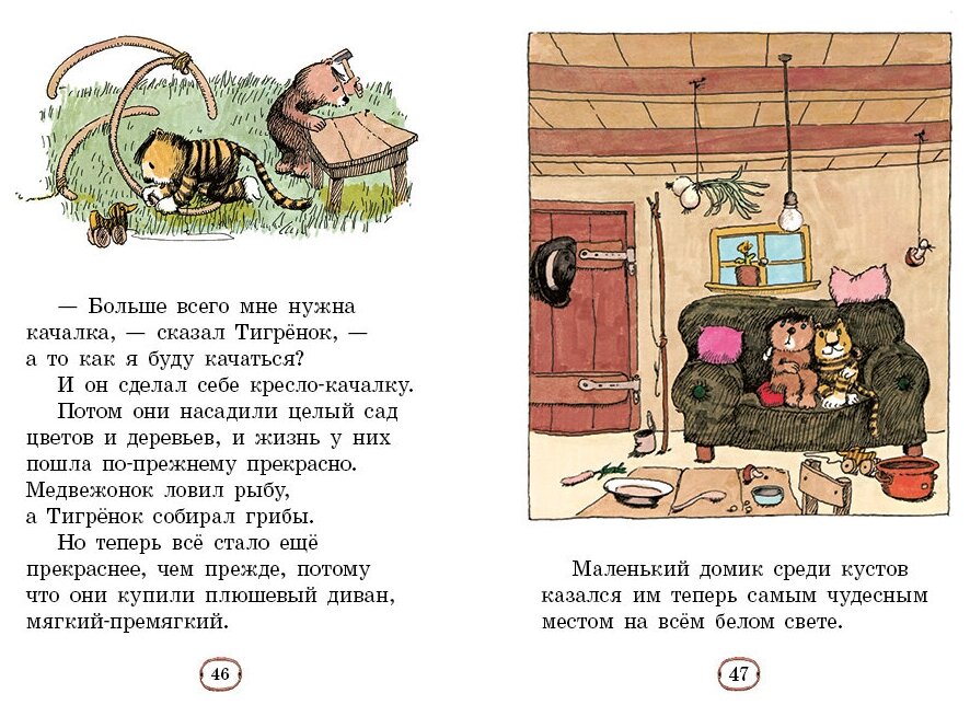 Медвежонок и Тигрёнок ? закадычные друзья, неразлучная парочка главных героев в лучших традициях детской литературы. Медвежонок, как более рассудительный и ответственный, играет в этих отношениях роль маленького взрослого, а Тигрёнок, игривый и непосредственный, скорее напоминает ребёнка. Друзья живут в уютном домике с трубой на крыше, под большим деревом у самой речки. И всё-то у них есть, чего душа ни пожелает, и ничего-то они не боятся, и потому смело отправляются навстречу приключениям. Дети будут с удовольствием слушать истории из жизни Медвежонка и Тигрёнка: о том, как те отправились искать далёкую страну Панаму; о том, как изобретали в своём родном лесу почту и телефон; и наконец, о том, как однажды Тигрёнок увлёкся дружбой с Поросёнком и чем эта дружба закончилась. Самых маленьких читателей, безусловно, привлечёт фабула, приключенческая сторона историй. А дети постарше и взрослые смогут разглядеть за событийной канвой нечто большее. Ведь по сути эти незамысловатые рассказики, пронизанные тонким юмором и иронией, исполнены философского смысла. Они, если так можно выразиться, об экзистенциальных переживаниях, свойственных каждому человеку с ранних лет. Об ощущении бытия, о моментах счастья, о чувствах истинных и ложных, об осмыслении себя в большом мире и о познании мира через внутренние переживания, которые порой сложно передать словами. Янош (настоящее имя Хорст Экерт) ? немецкий автор и иллюстратор книг для детей. Его произведения переведены на 47 языков и изданы общим тиражом более 5 миллионов экземпляров по всему миру. Благодаря крупному шрифту и отсутствию переносов в словах книга подойдёт для первого самостоятельного чтения. В сборник ?Медвежонок и Тигрёнок? вошли 3 сказки: ?О, как ты прекрасна, Панама?, ?Письмо для Тигра?, ?Привет, Поросёнок!?. Первые две ранее выходили в нашем издательстве отдельными книгами.