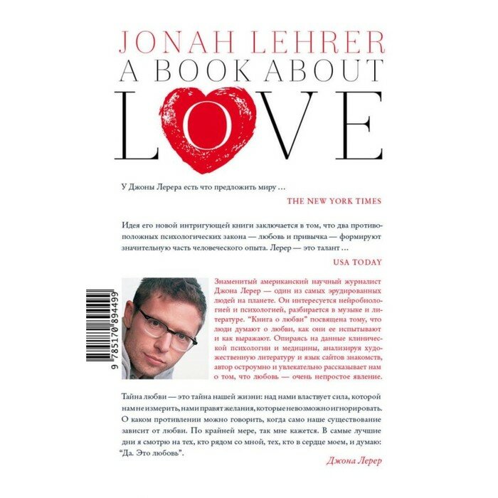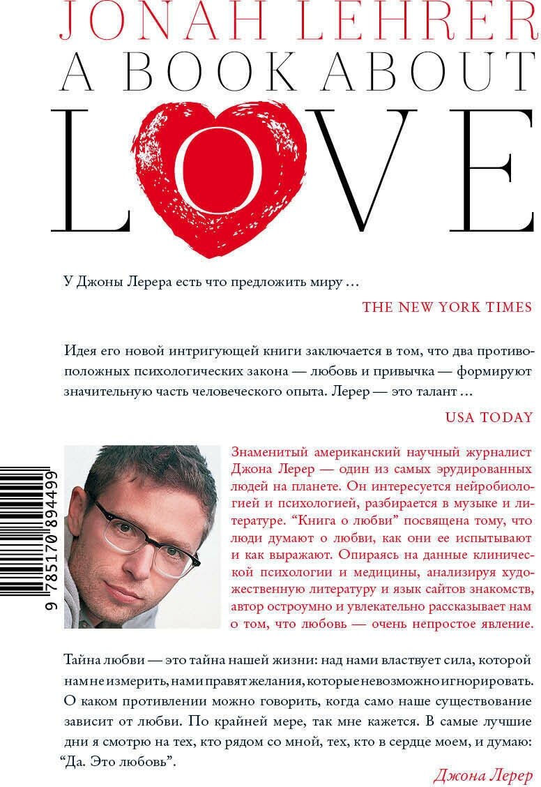 Знаменитый американский научный журналист Джона Лерер — один из самых эрудированных людей на планете. Он интересуется нейробиологией и психологией, разбирается в музыке и литературе. “Книга о любви” посвящена тому, что люди думают о любви, как они ее испытывают и как выражают. Опираясь на данные клинической психологии и медицины, анализируя художественную литературу и язык сайтов знакомств, автор остроумно и увлекательно рассказывает нам о том, что любовь — очень непростое явление.