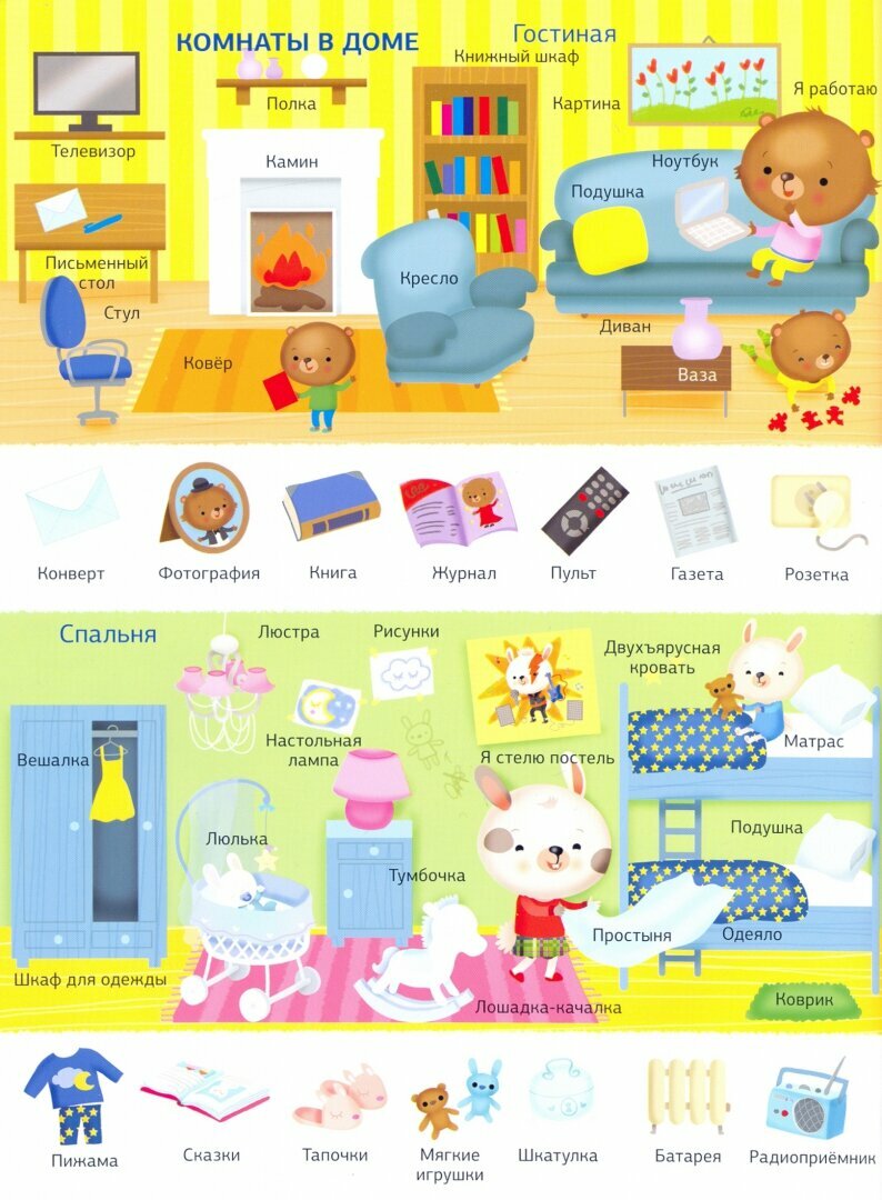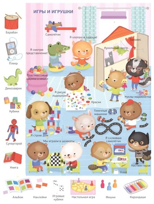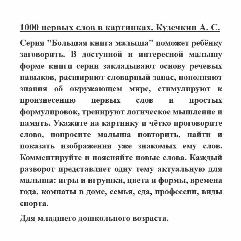 Серия «Большая книга малыша» поможет ребёнку заговорить. В доступной и интересной малышу форме книги серии закладывают основу речевых навыков, расширяют словарный запас, пополняют знания об окружающем мире, стимулируют к произнесению первых слов и простых формулировок, тренируют логическое мышление и память. Укажите на картинку и чётко проговорите слово, попросите малыша повторить, найти и показать изображения уже знакомых ему слов. Комментируйте и поясняйте новые слова. Каждый разворот представляет одну тему актуальную для малыша: игры и игрушки, цвета и формы, времена года, комнаты в доме, семья, еда, профессии, виды спорта.