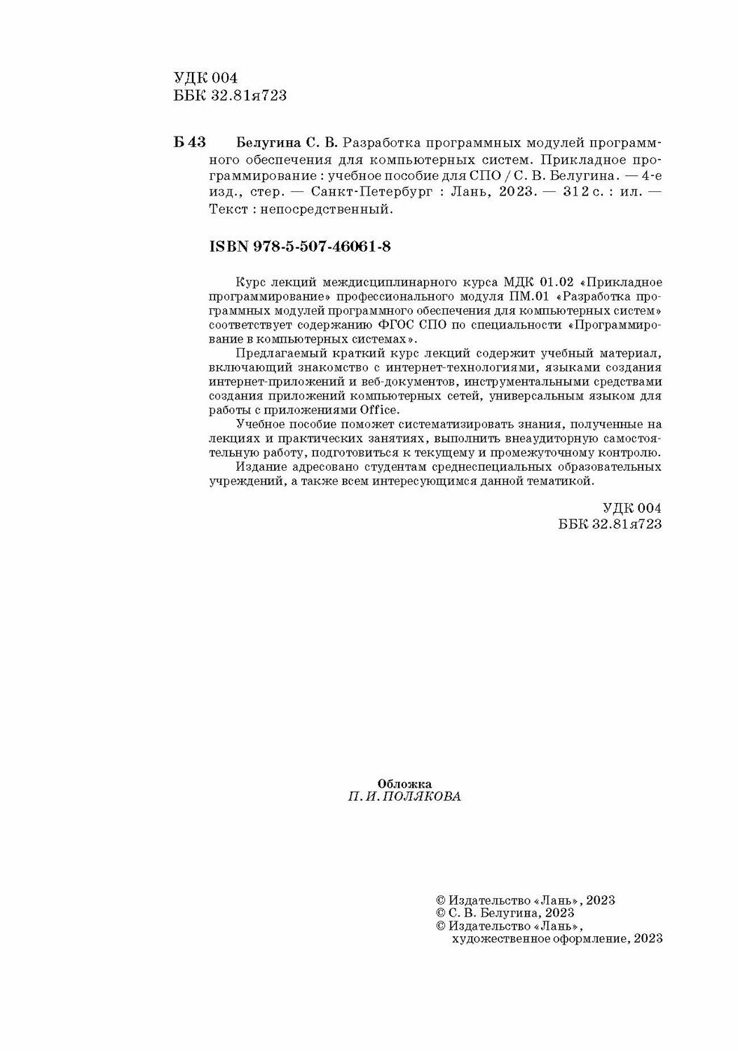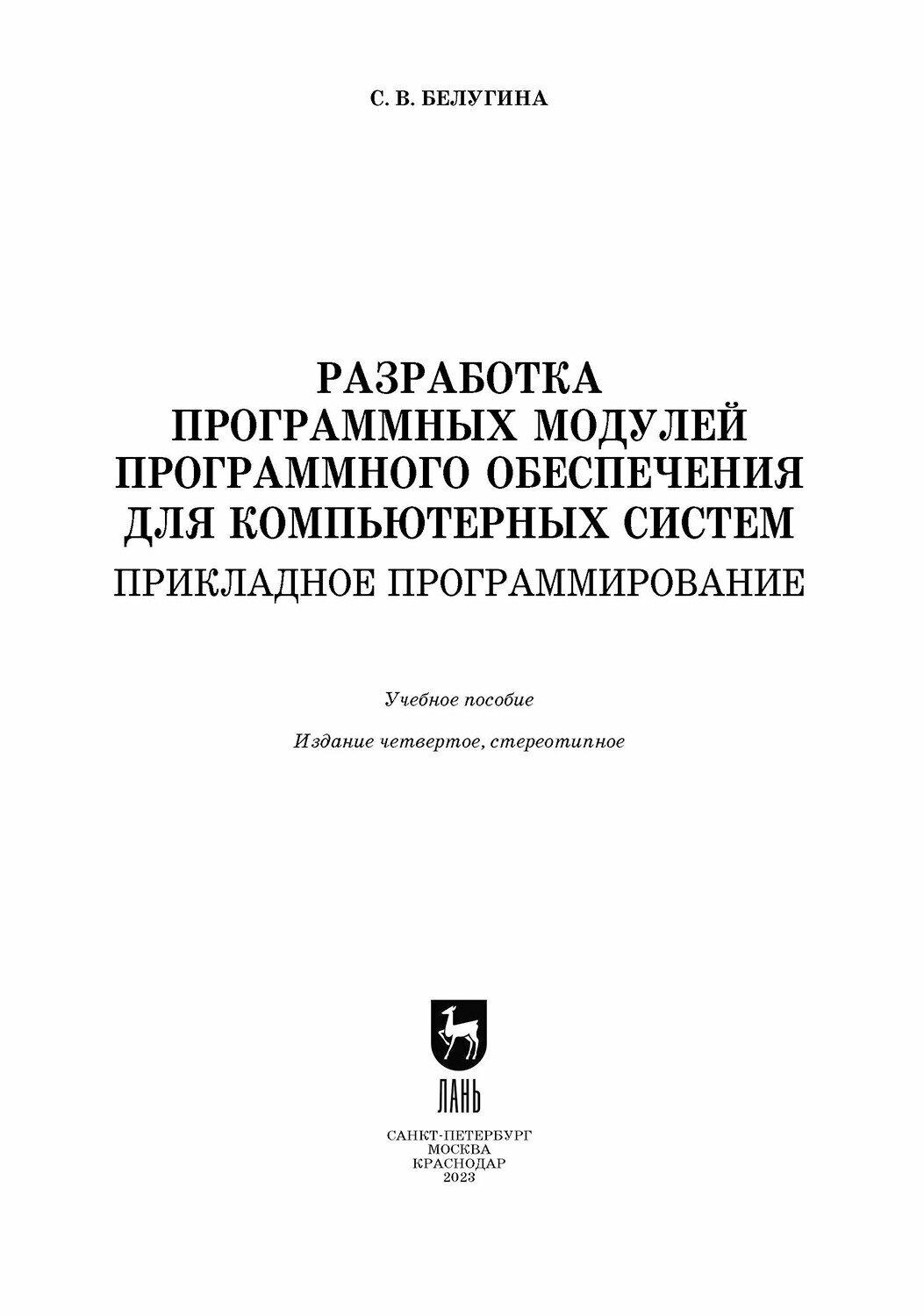 Разработка программных модулей программного обеспечения для компьютерных систем. Прикладное програм. (Белугина Светлана Викторовна); Лань, 2022