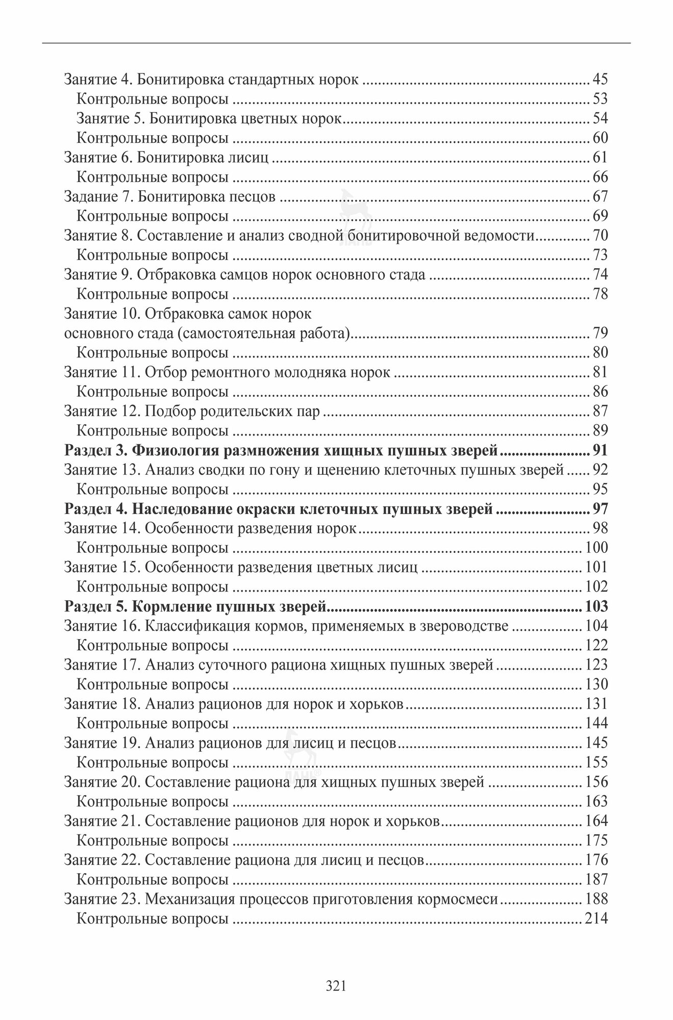 В учебном пособии рассмотрены практические занятия по изучаемым темам курса «Звероводство». Даны основные виды, породы и породные типы клеточных пушных зверей, их краткая характеристика. Описаны физиология размножения, основные периоды года в звероводстве. Дана классификация и приведена характеристика основных и нетрадиционных кормов, рационы для разных видов пушных зверей, в приложении указаны основные корма, их питательная ценность и переваримость, а также процессы механизации для приготовления кормосмеси на кормокухне. Подробно рассмотрена бонитировка и даны задания для самостоятельной работы.