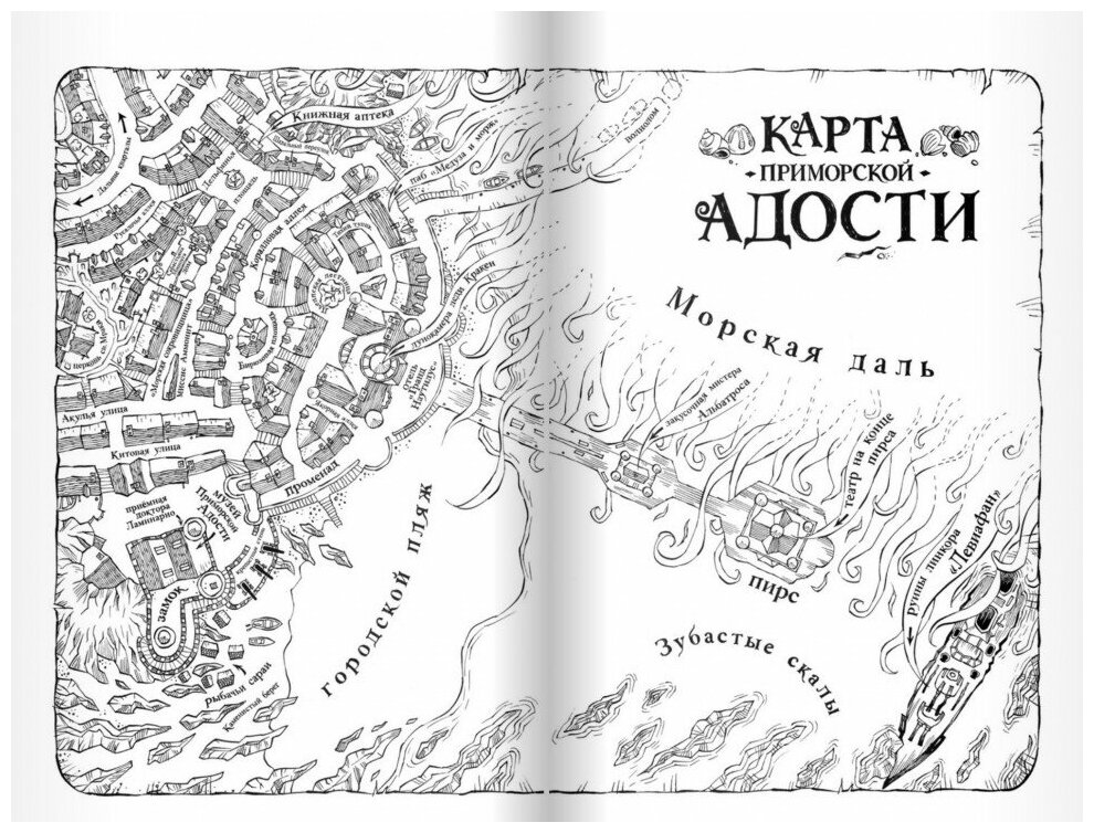 Ну смотрите: мальчик-заведующий бюро находок Герби Лиммон и его внезапная неожиданность, таинственная сирота Виолетта Парма). Хозяйка гостиницы в жутковатом местечке Приморская Адость Леди Кракен (и ее милейший призрачный дедушка с кровью буквально водицей, под которым мыслится Капитан Крюк), управляющий Мистер Моллюск, странная тетушка Аммонит и лихой владелец закусочной мистер Альбатрос, доктор Ламинарио, литератор Миноуг и, наконец, Дженни Саргасс, владелица книжной аптеки (!) с судьбоносной рыбозьянкой (!), выписывающей книжный рецепт (ААА!) и хранящей секреты *и скелетов в шкафу*. А? А?))))) Нам всем срочно нужны книжные рецепты на лихо закрученного сюжетно и словесно Зломандра!