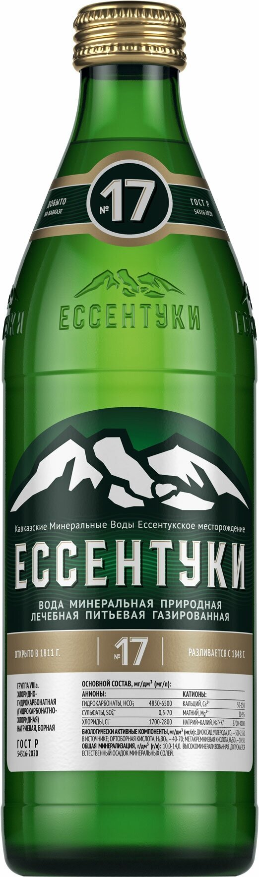 Описание товара:Природа формирует "Ессентуки" на протяжении более чем 800 лет: дождевая и талая воды просачиваются через породы Кавказских гор, которые под действием древнего вулкана Эльбруса растворяются, обогащая воду полезными минералами и газами. Минеральная вода "Ессентуки № 17" обладает мощным профилактическим и лечебным эффектом: эффективна в рамках комплексной терапии при ОРВИ для ингаляций, помогает улучшить функцию иммунной системы, способствует выведению токсинов из организма, эффективна при лечении органов ЖКТ, эффективна при нарушениях обмена веществ, помогает улучшать углеводный и липидный обмен, секрецию инсулина, оказывает стимулирующее влияние на бактерицидную активность кожи при наружном применении (орошения, компрессы, маски), а также благоприятно влияет на различные функции кожи: иммунитет, обменные процессы, кровообращение. Является источником полезных минеральных веществ. Уникальный состав воды формировался более 800 лет и содержит более 30 разных минеральных веществ, в том числе кальций, калий, натрий, магний, кремний и бор.Состав товара:Вода минеральная природная лечебно-столовая питьевая газированная. Минерализация: средняя 10—14 г/л.