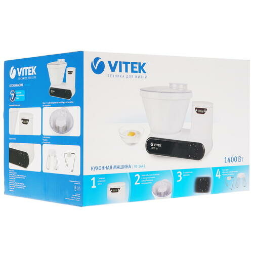 Кухонная машина Vitek приятно удивит каждую хозяйку наличием электронных весов, которые позволят с невероятной точностью отмерить необходимое количество ингредиентов для приготовления того или иного кулинарного изыска. Комплект включает в себя прозрачную крышку со специальным отверстием, незаменимым для добавления ингредиентов прямо в процессе функционирования устройства. Модель Vitek справится не только со смешиванием или тщательным взбиванием продуктов. Вы также сможете доверить ей процесс приготовления теста необходимой консистенции. Для изготовления основной 5-литровой чаши использовался пищевой пластик, не способный провоцировать выделение вредных для вашего здоровья соединений. Кроме того, очистка данного материала от различных загрязнений потребует у вас минимум времени и усилий.