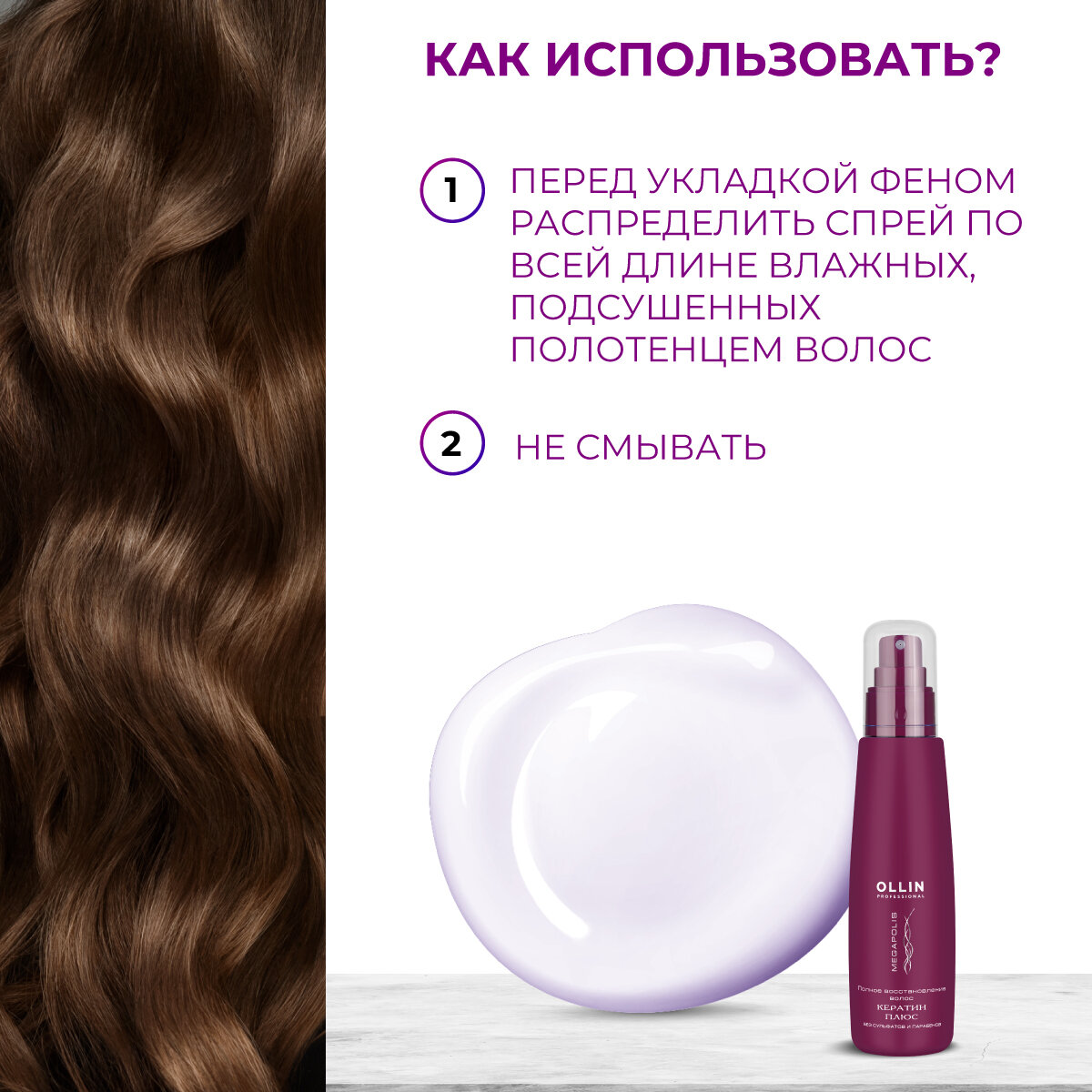 Способ применения: перед укладкой феном распределить спрей по всей длине влажных, подсушенных полотенцем волос. Не смывать.
