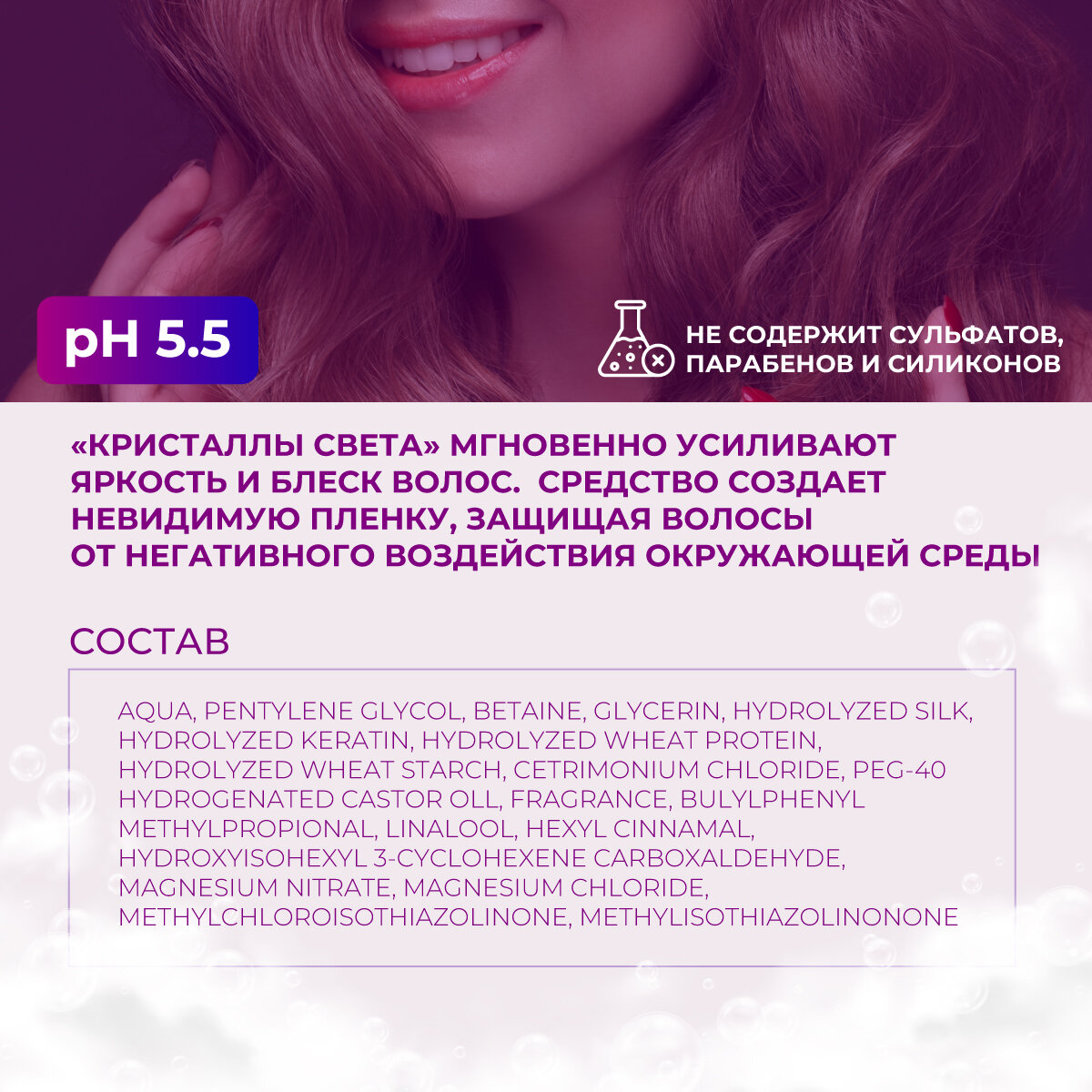 | Состав | Aqua, Pentylene Glycol, Betaine, Glycerin, Hydrolyzed Silk, Phenoxyethanol, Ethylhexylglycerin, PEG-40 Hydrogenated Castor Oil, Cetrimonium Chloride, Hydrolyzed Keratin, Hydrolyzed Wheat Protein, Hydrolyzed Wheat Starch, Parfum, Butylphenyl Methylpropional, Linalool, Hexyl Cinnamal |
