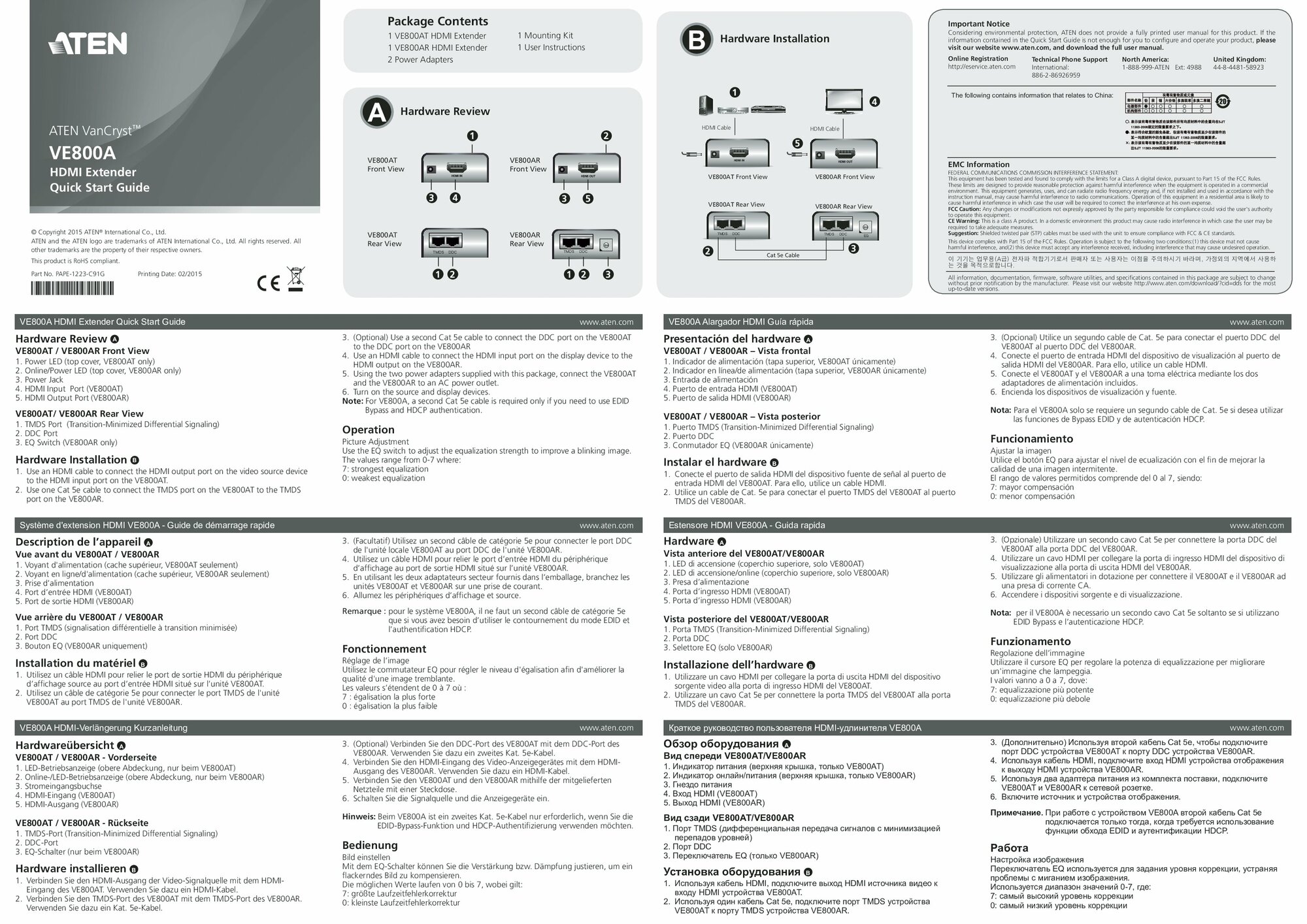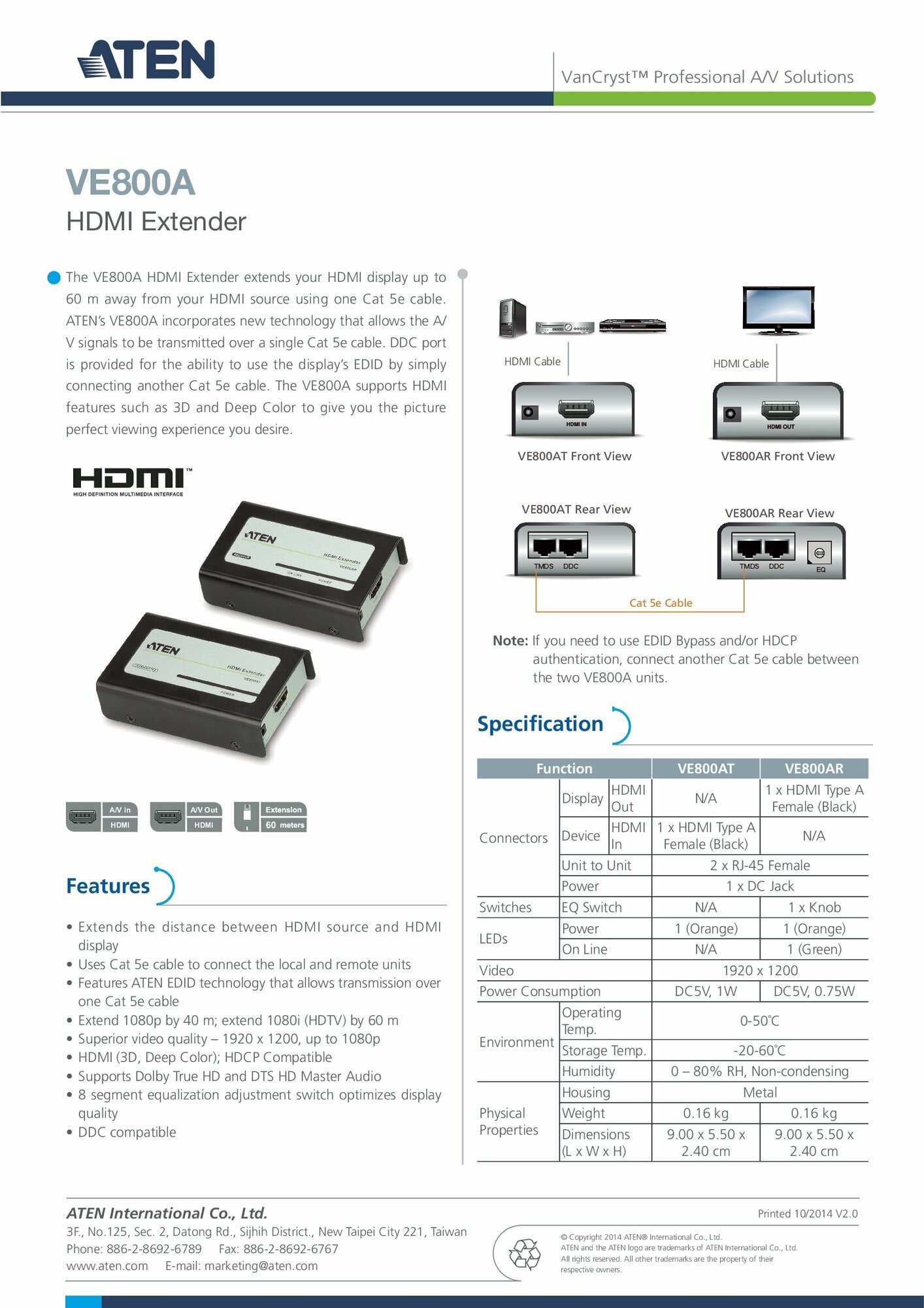 HDMI видео удлинитель Aten позволяет передавать видеосигналы HDMI на расстояние до 60 метров от источника HDMI сигнала, используя один кабель витая пара Cat 5e. Наличие DDC порта предусматривает возможность использования EDID дисплея простым подключением второго кабеля витая пара Cat 5e. В комплектацию входит модуль T (передатчик) и R (приемник), без кабелей HDMI.