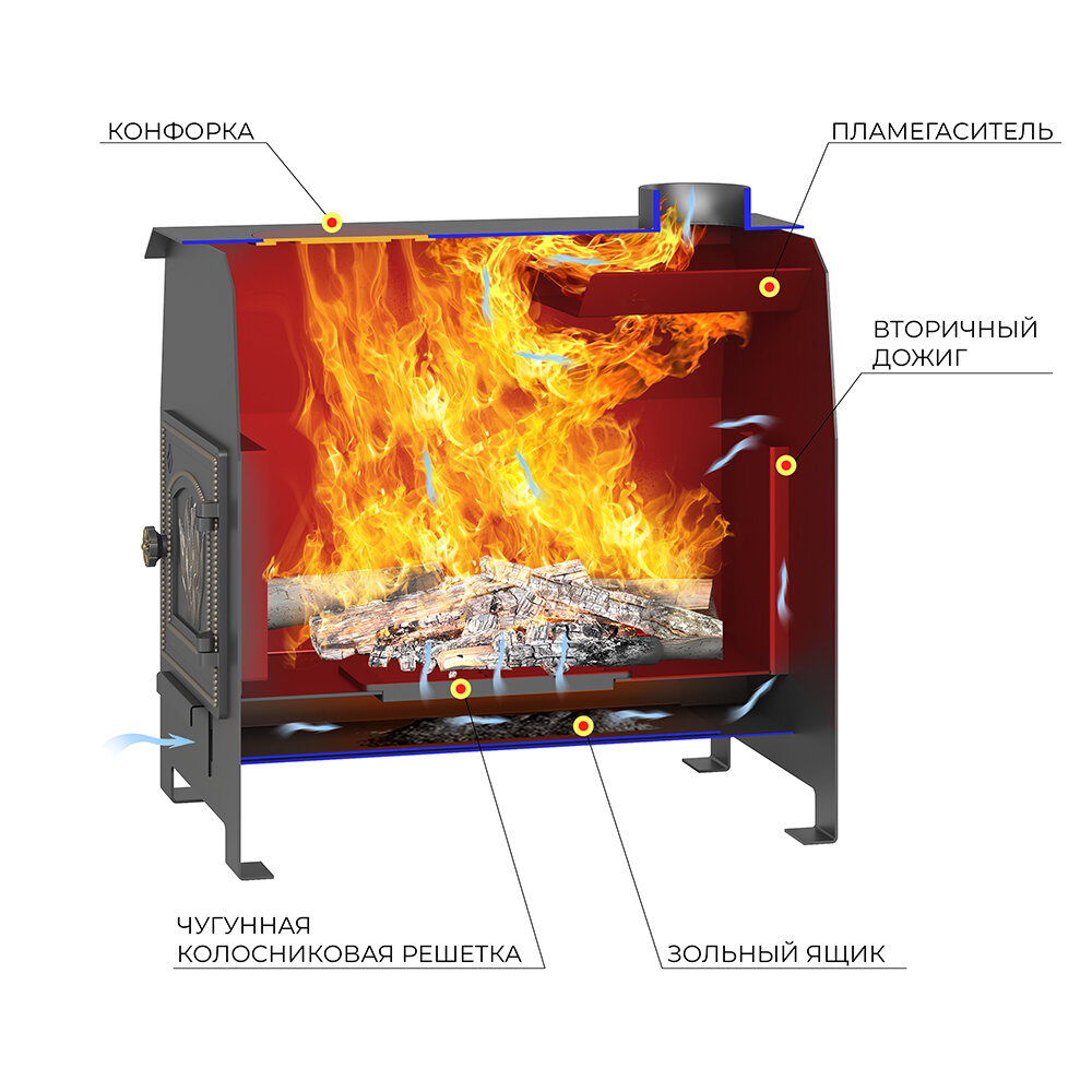 | Особенности конструкции | зольный ящик, варочная панель, колосник, конвекционно-вентилируемый кожух |