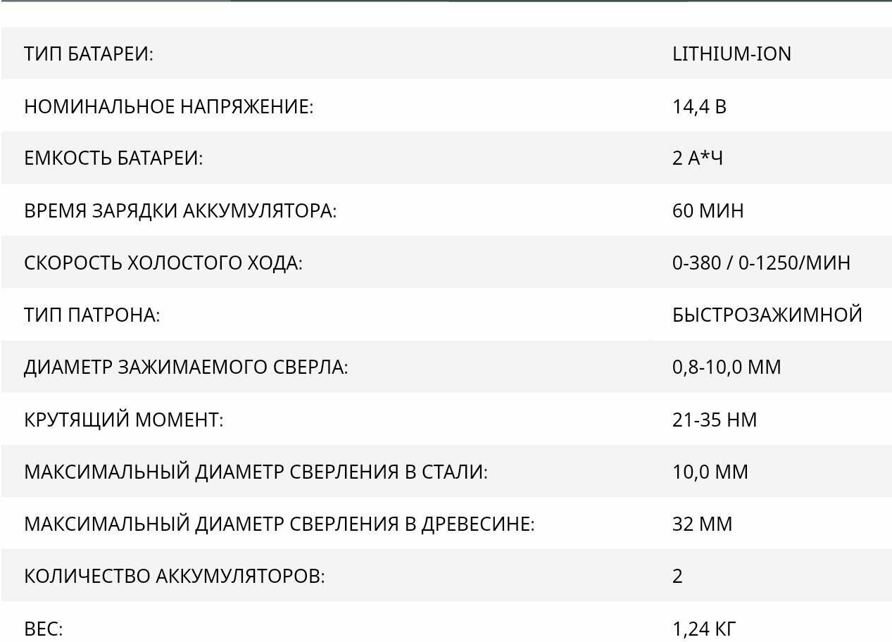 | Тип инструмента | аккумуляторная дрель-шуруповерт |