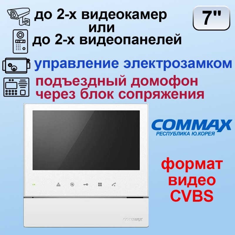 Commax – цветной видеодомофон на 2 вызывные панели. Экран 7 дюймов (17,78 см) LCD TFT с LED-подсветкой, обеспечивающей чёткое и насыщенное изображение. позволяет увидеть на экране монитора посетителя, позвонившего в вызывную панель, поговорить с ним, открыть электромеханический или электромагнитный замок нажатием кнопки на мониторе. Переключение на вторую видеокамеру осуществляется повторным нажатием на кнопку просмотра изображения.