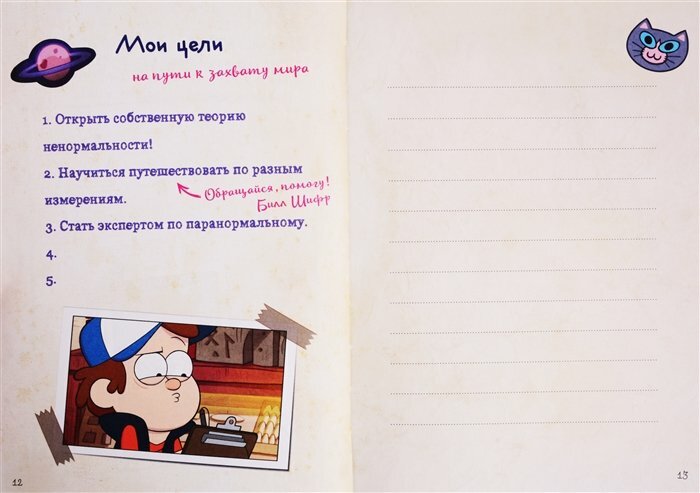 Креативный дневник по мотивам сериала "Гравити Фолз". В нём есть всё, что может вдохновить на новые свершения! Загадывайте желания, записывайте цели и задачи, планируйте приключения, сочиняйте истории, рисуйте и просто творите! Тут найдётся достаточно места для гениальных идей. Также внутри вы найдете потрясные задания от героев сериала, которые точно не дадут заскучать. Уникальный дневник для вдохновения, внутри которого увлекательные задания, календарь, списки, место фото и много другое. Скорее начинайте вести ежедневник! Близнецы Пайнс, Пухля, дядя Стэн, Зус и другие жители "Гравити Фолз" ждут вас!