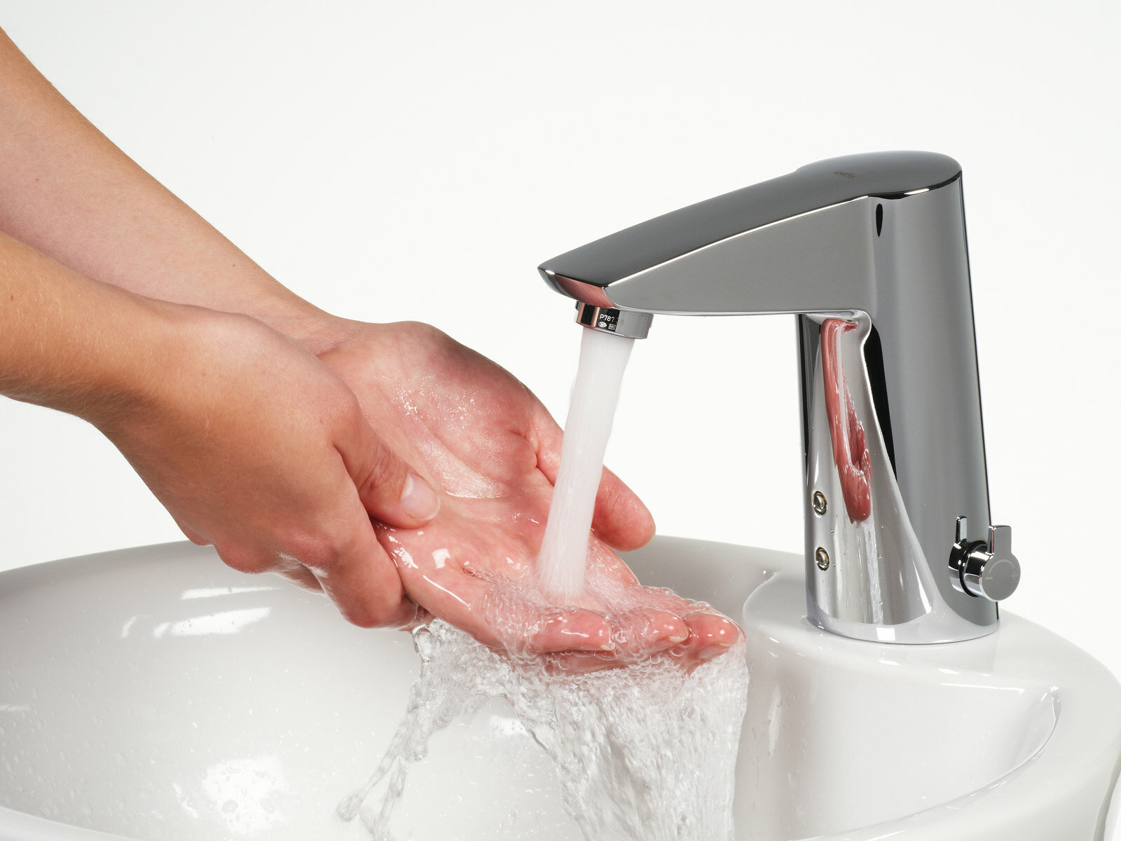 Бесконтактный смеситель с рукояткой регулировки температуры. Укомплектован грязевыми фильтрами и обратными клапанами. Работает от батареи 6 В. При установке смесителя не требуется настройка его параметров, поскольку в нем используется улучшенный датчик с системой автофокуса. Клапан с импульсным управлением обеспечивает длительный срок службы батареи. Ограничитель потока (6 л/мин) уменьшает расход воды.