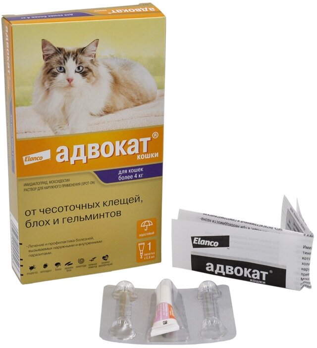 Адвокат® кошки защищает кошек внутри и снаружи. Он обеспечивает комплексную защиту от блох, сердечных и кишечных глистов, легочных глистов, ушных клещей, подкожных клещей у кошек и применяется для наружной обработки на холку 1 раз в месяц.