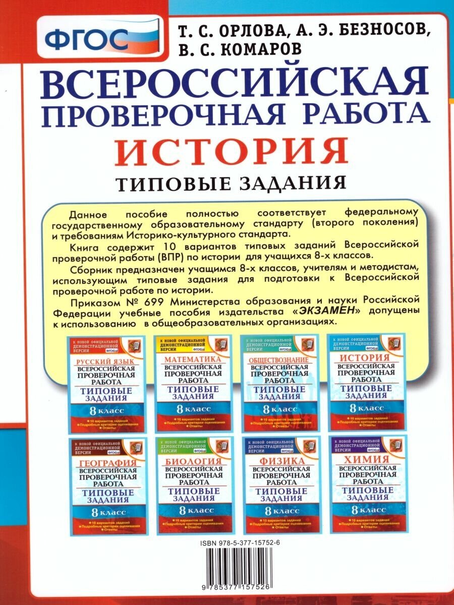 ВПР. История. 8 класс. 10 вариантов. Типовые Задания. (Орлова Татьяна Сергеевна, Комаров Владимир Сергеевич, Безносов Александр Эдуардович); Экзамен, 2022